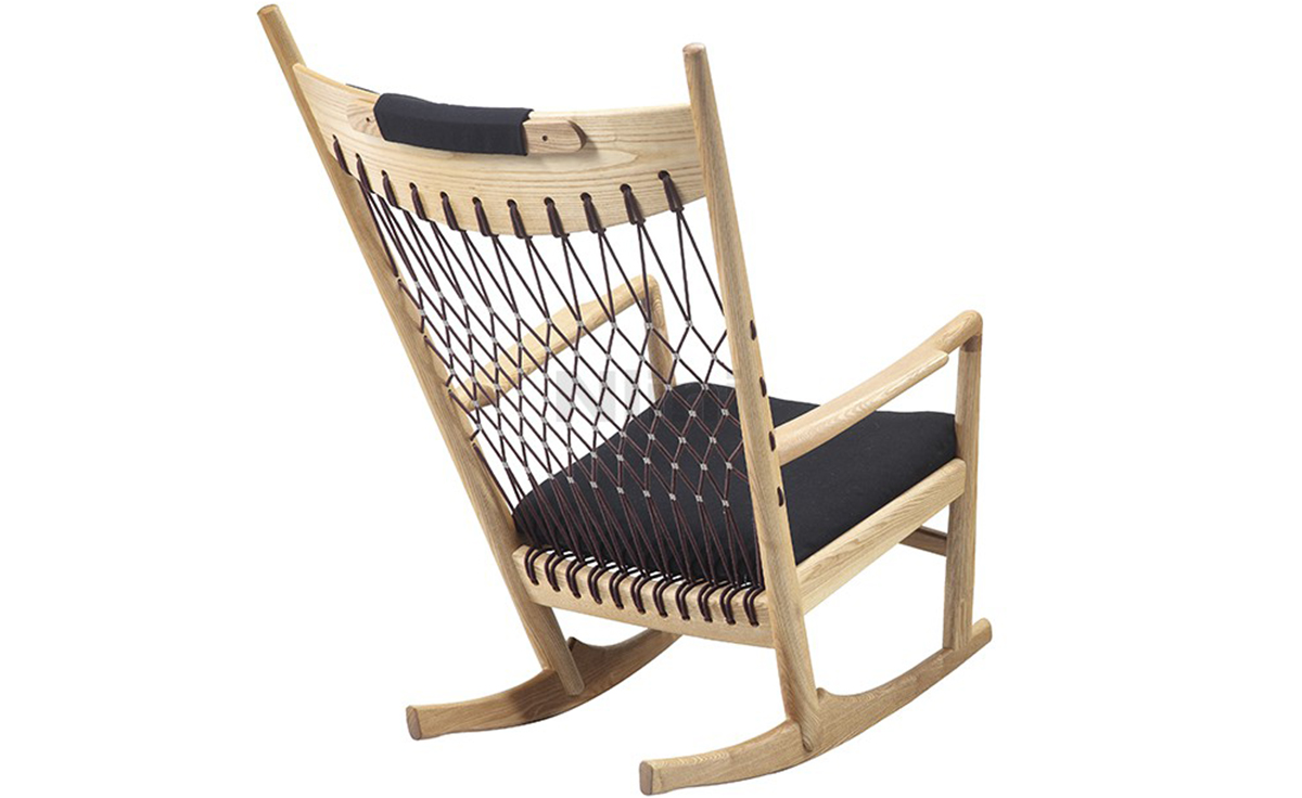 Rocking Chair(摇椅)是大师Hans J. Wegner设计的众多摇椅中的经典之作。摇椅具有简洁的线条,精准的的人体工学结构,是Hans J. Wegner在1944年为身怀六甲的妻子设计,扶手前端微微向外展开,是为让妻子方便起身。实木制成,轻便耐用,简约单纯,仍于潮流中立于不败之地,为Hans J. Wegner最受欢迎的经典作品之一。我们已经能从中感受到圈椅的影子。摇椅水曲柳制作,坐垫麻布软布(内部填充优质海绵),棉绳编织(有白色,黑色,棕红色可选)。