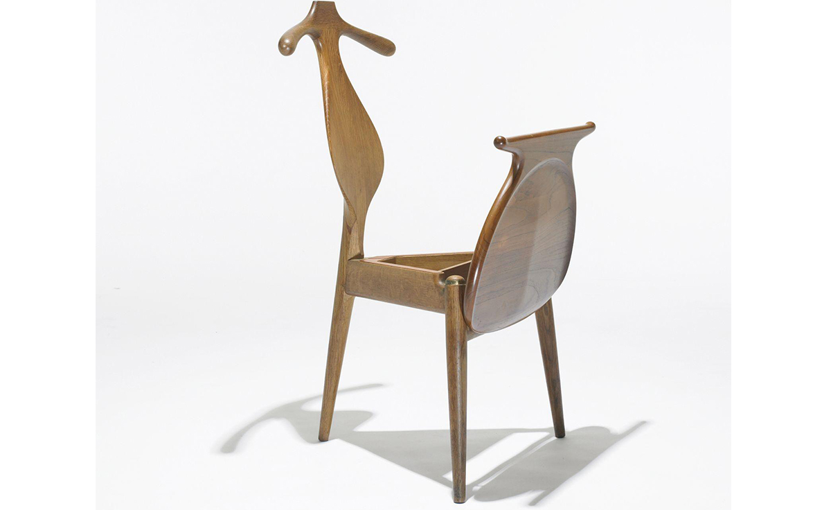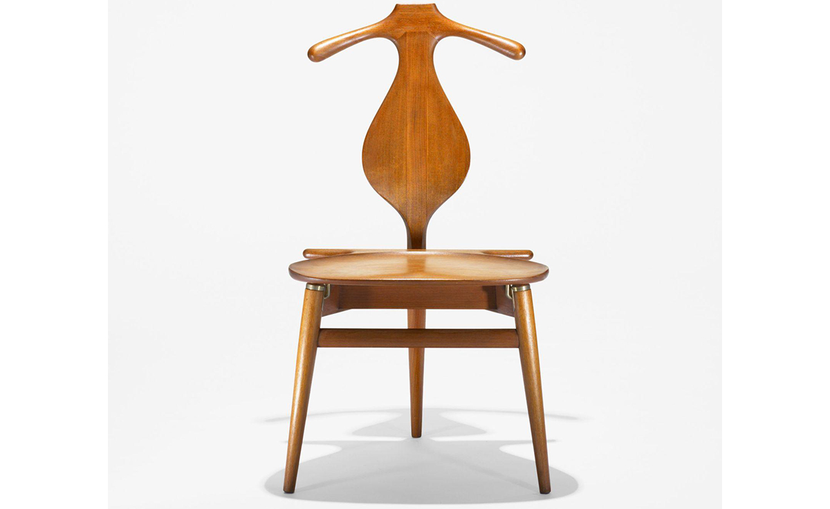 The Valet Chair(侍从椅),1953年设计,是Hans J. Wegner的经典代表作之一。这把椅子是Hans J. Wegner同建筑师 Steen Eiler Rasmussen 和设计师 Bo Bojesen 聊天谈到就寝时折叠衣服的麻烦,他就做了这个有趣的设计,为了让它看起来不笨重,从4条腿减到3条。靠背两侧选用对称的木纹,木纹的机理是整个靠背有机曲线的补充。椅子看起来像一把提琴,又像一个穿着燕尾服的侍从,不但具有美感,而且很具实用性。