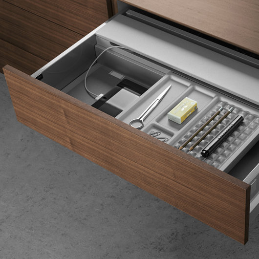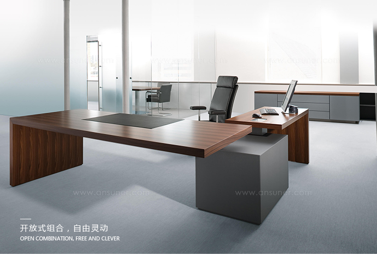 桌面和侧面,水平和垂直形成一个均匀的结构,是Headoffice Mono系列会议项目设计团队所执行的结构概念。强大的线条与精选材料的优雅相结合。由侧面和桌面所制成的直角,中间的桌子上有醒目皮革包裹的面板,如果有需要,可以使用滑动皮板来打开集成线路。电缆布线隐藏在桌面和副柜之间。