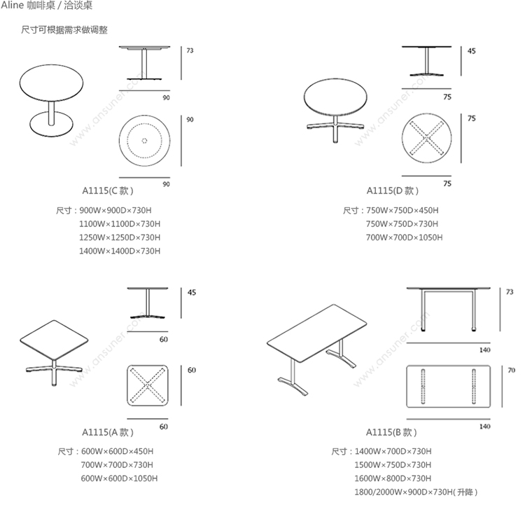 Aline 咖啡桌 系列尺寸/示意图