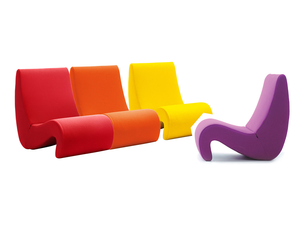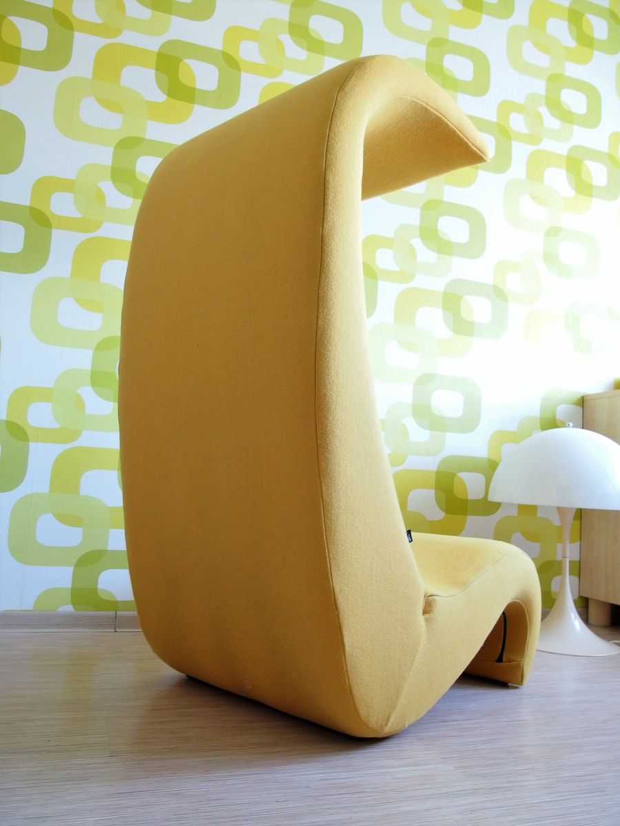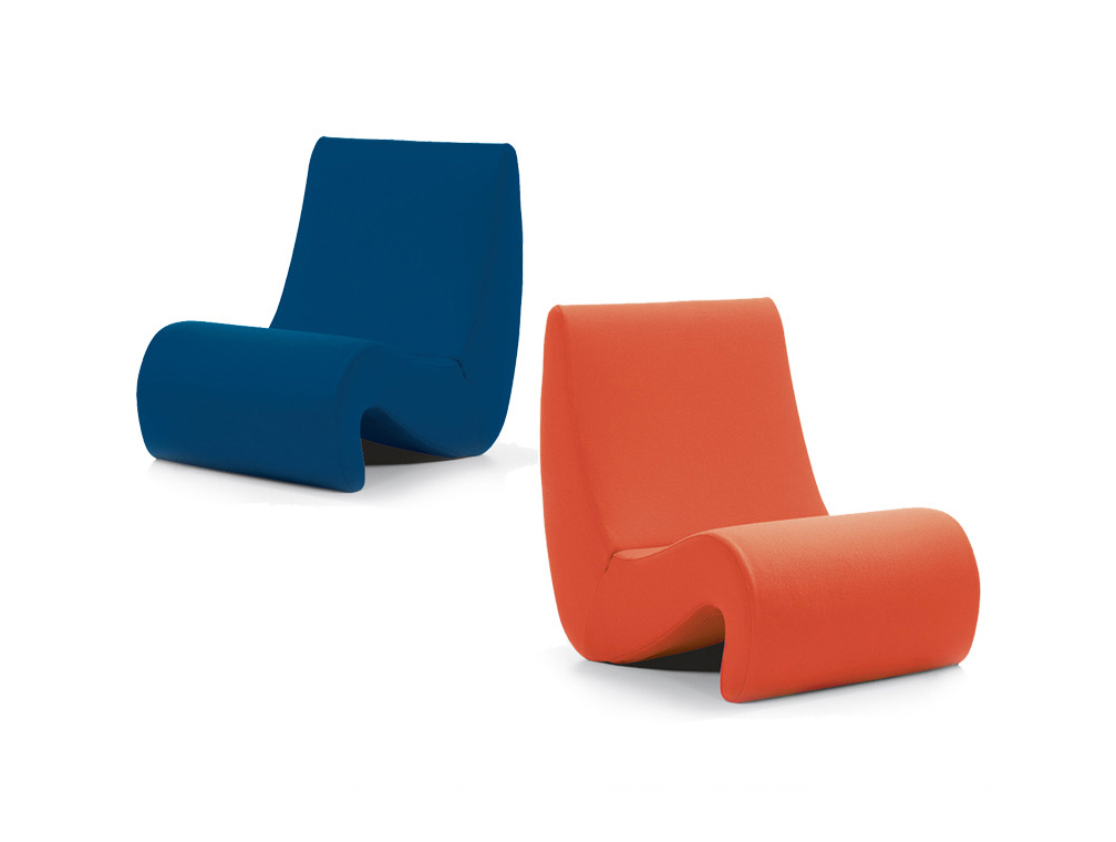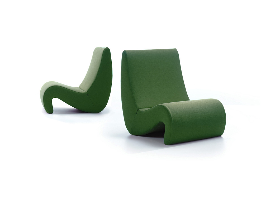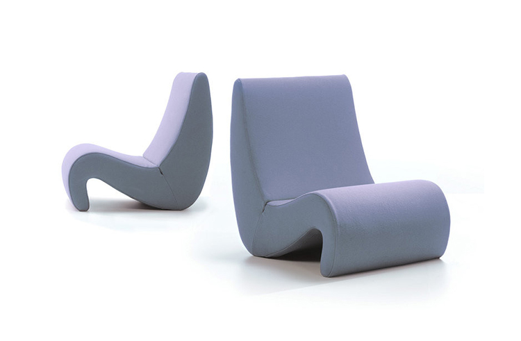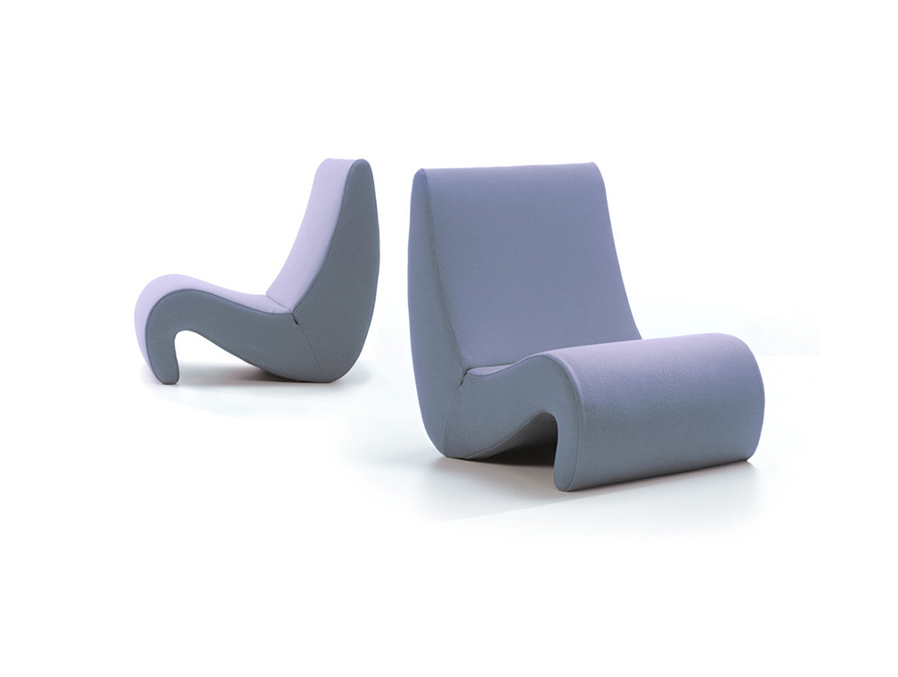 椅子的Amoebe Highback版本有一个灵活的靠背,可以在保姆的头部弯曲,形成一个雕塑的顶篷。 这种醒目的口音赋予椅子一种住所和隔离感。