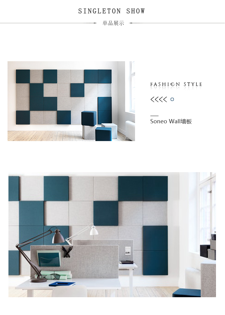 Soneo Wall提供具有吸音方块的功能性创意。由于其时尚,不引人注目的设计,它可以覆盖更大的墙壁区域,从而融入环境。可以使用Soneo Wall的颜色和相对定位创建令人兴奋的阵型。方形墙模块可以组合以创建不同的图案形式。每个模块包括安装在木框架上的吸音再生聚酯填料。两侧均采用布料。背面配有黑色面料作为标准配置。安装在钢制墙托架上。