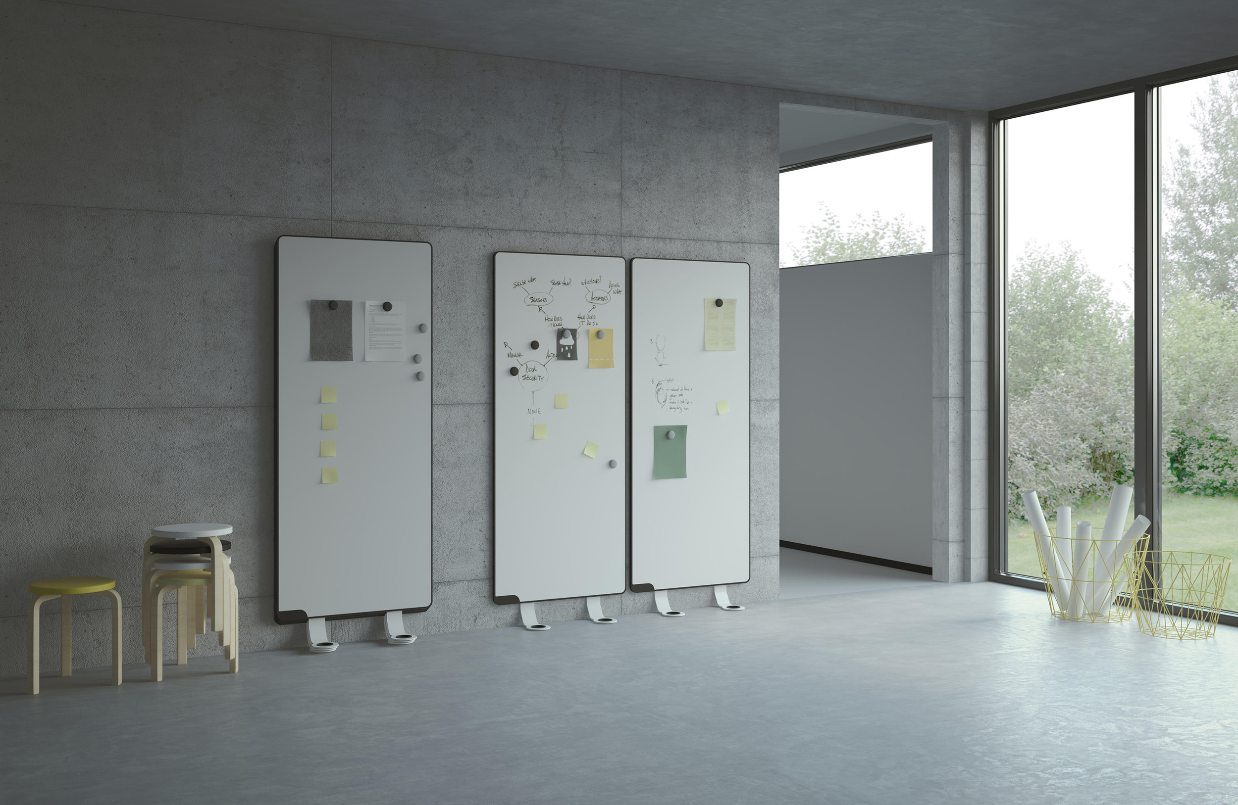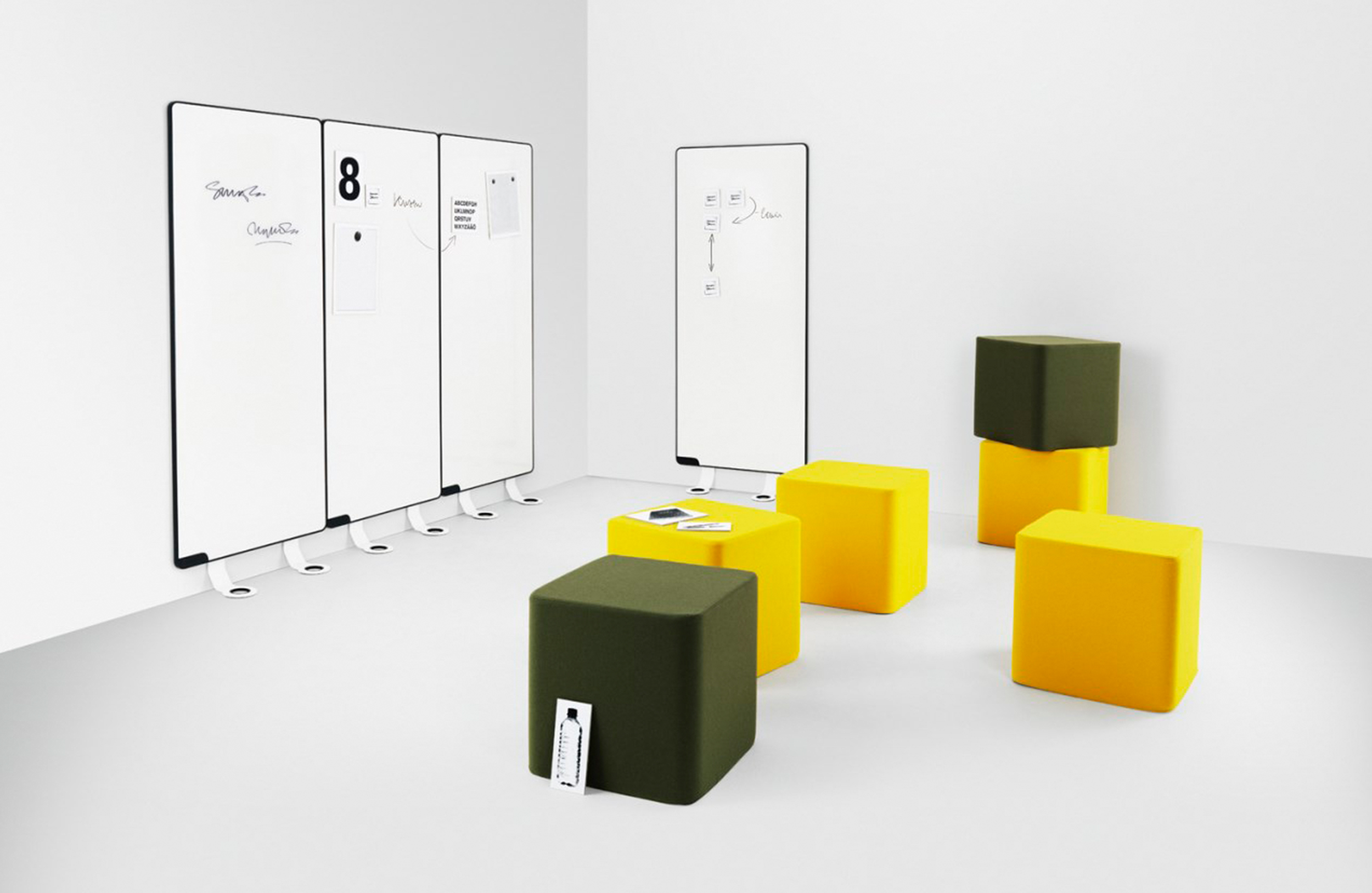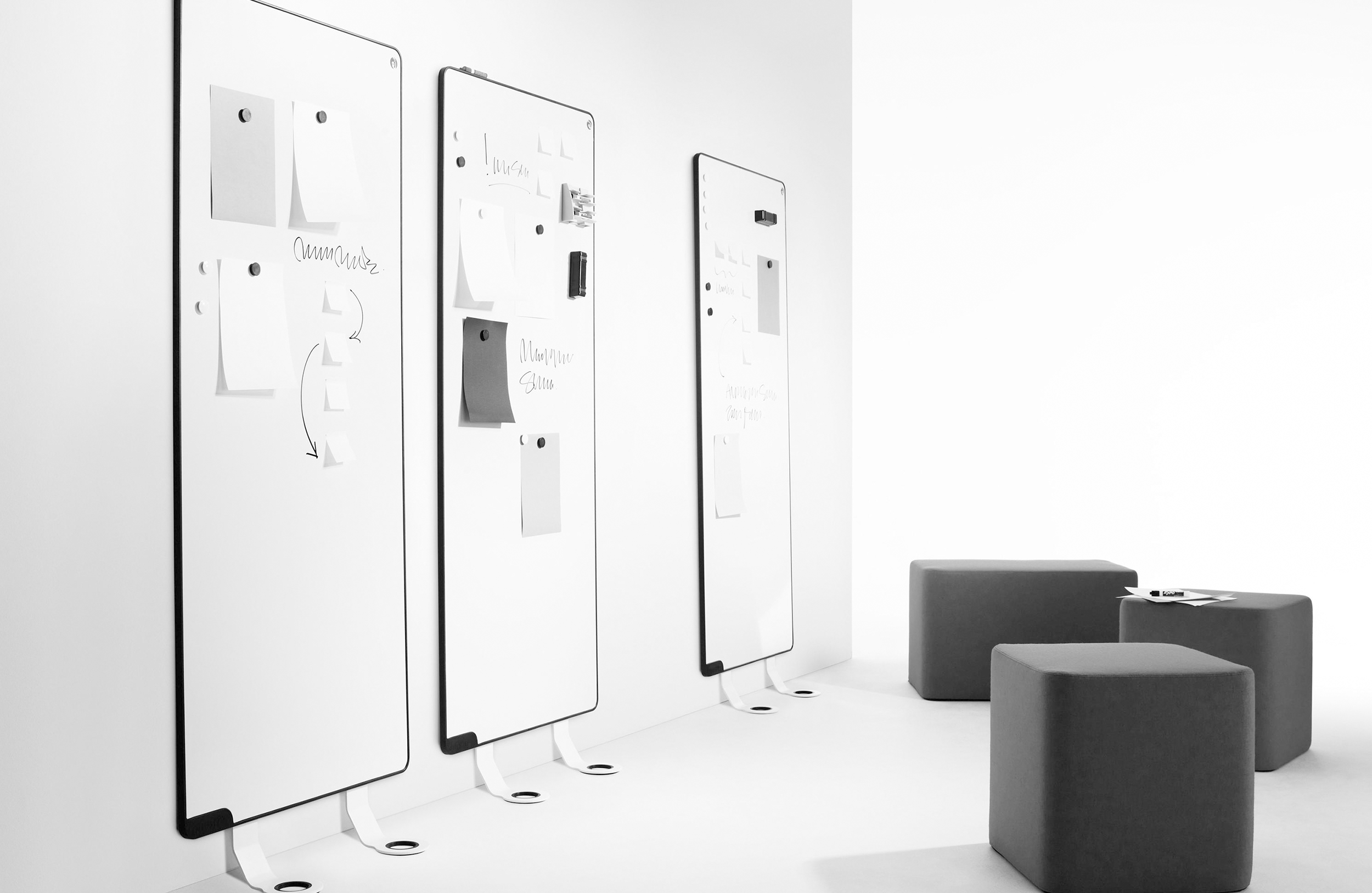 Sketchalot是一种独特的书写板,无需任何墙壁安装。该设计允许板垂直于墙壁倾斜。因此,Sketchalot非常适用于有玻璃或混凝土墙的环境,或者您不希望在墙上打洞的任何房间。电路板相互堆叠,便于存放。书写板由刨花板主体上的E3磁性搪瓷钢板组成。白色珐琅金属板背面。框架由模制的圆形凸起黑色塑料边缘组成。白色铝脚可以不用工具安装。这些板非常适合将多个板紧密地安装在一起。