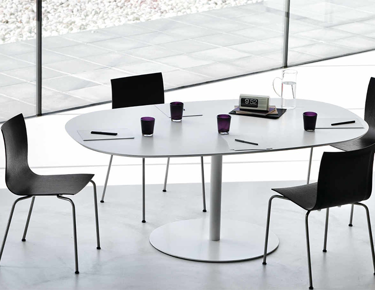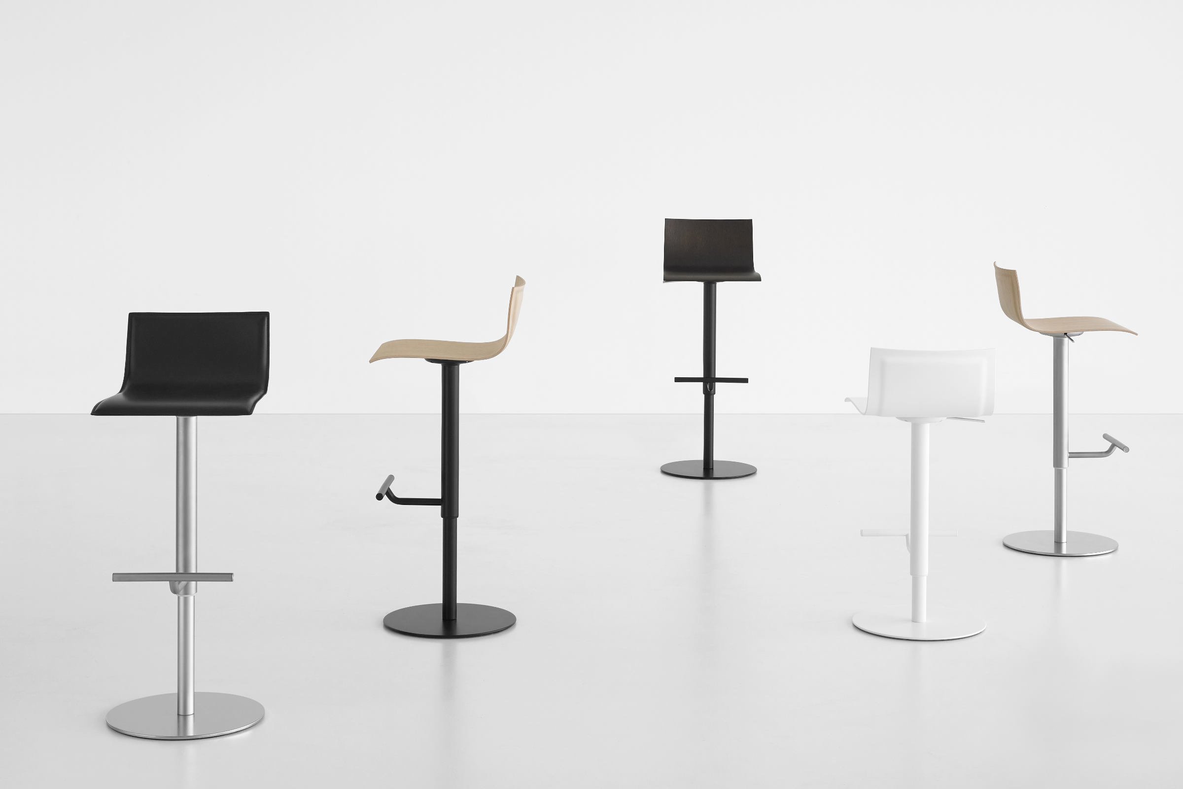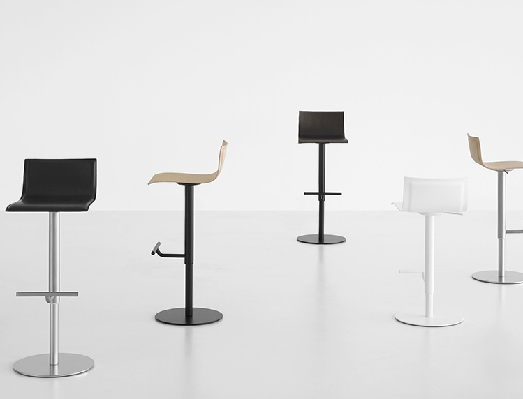 用旋转座椅和可调整高度的大便与喷砂不锈钢和钢中的圆形底座与«亚麻织物»图案或完全粉末涂覆。座椅在几个饰面与厚度变化胶合板,更薄的边缘。有多种饰面或在皮革软垫。