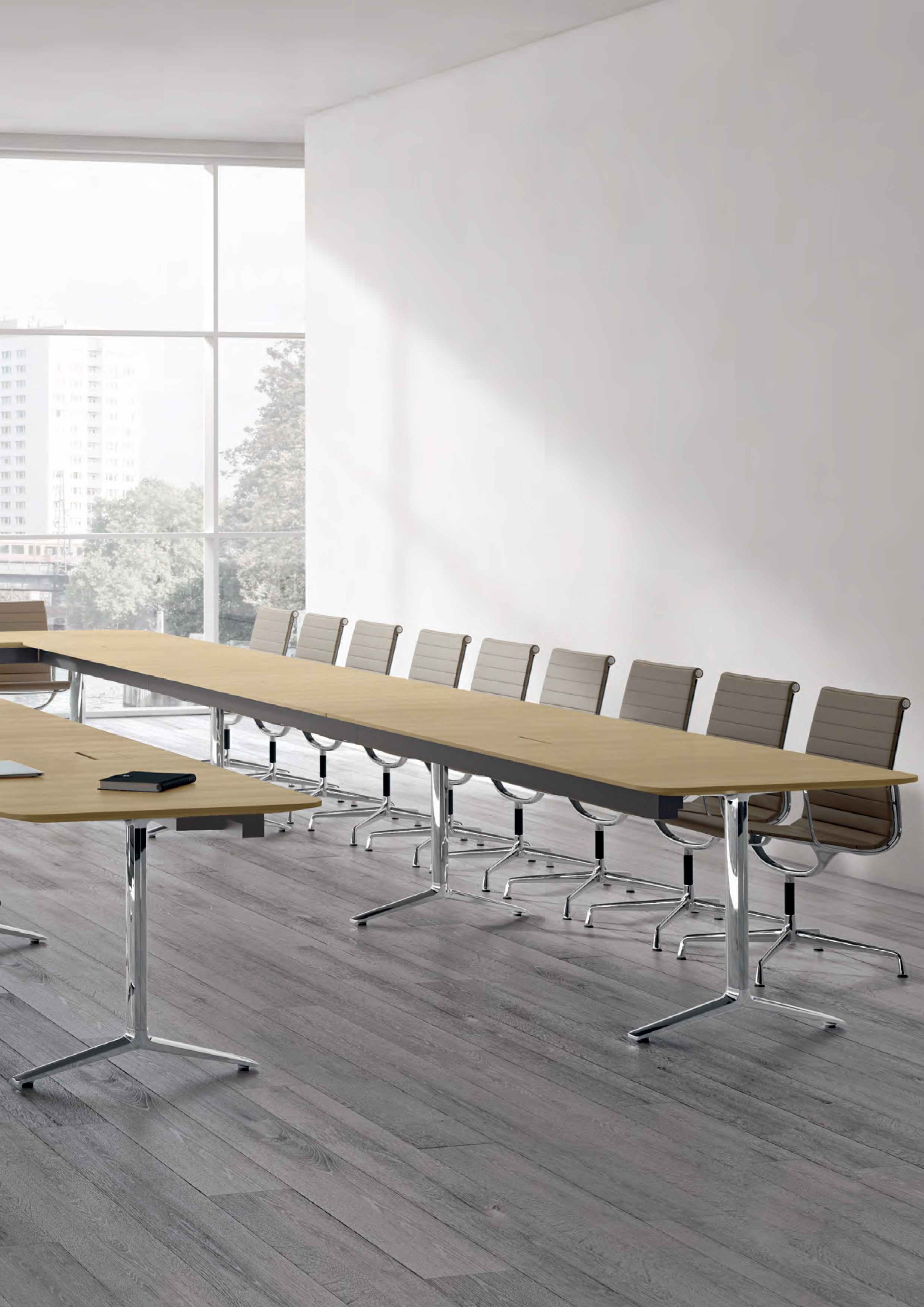 纤薄的桌面,镀铬铝合金桌脚,台架结构除了保证稳定性,以及最大化的腿部空间之外,它还能实现相邻两块桌面的巧妙连接。不仅如此,所有拼装和拆卸均无需任何工具,方便快捷。