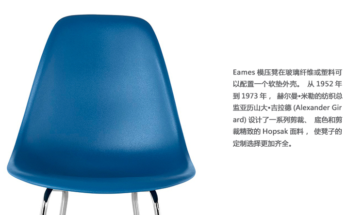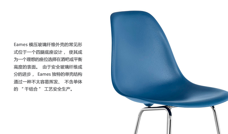 本单品为Eames Plastic Chair 系列成员之一,舒适的椅座外观设计是以添加了玻璃纤维强化的塑料来制作,再搭配上各式不同的脚座来增添使用的多样化,值得一提的是Eames Plastic Chair 的创新技术与材质,便它得以成为全世界第一张被大量制造的单椅。拜现今创新的科技所赐,全系列的Eames Plastic chair 终于再次制造,使用环保可回收的聚丙烯材质,求制作线条优美的椅座外壳,不但重量更轻,同时更具有更好的耐热性及抗化学性。
