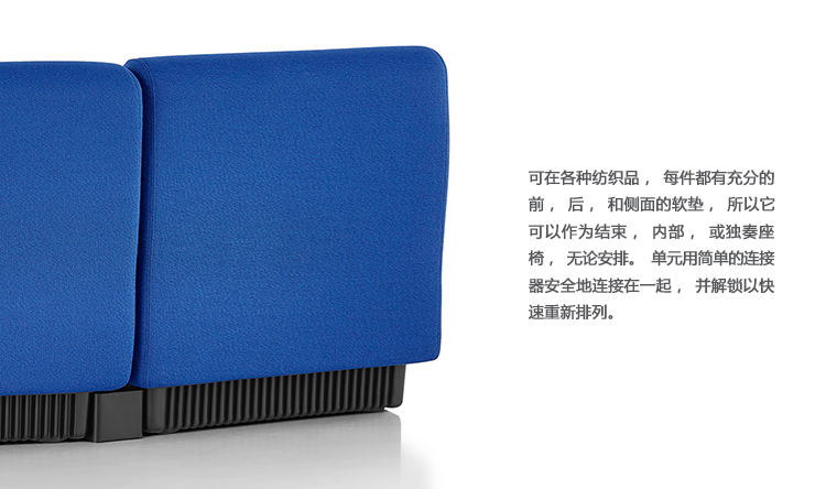 五个简单的单元——每个单元都是一个模压的、雕刻的形状,提供了一个软外观的支持——允许系统呈现多种形式。在后面的深口袋让空气循环周围的保姆和更容易清洗。可在各种纺织品,每件都有充分的前,后,和侧面的软垫,所以它可以作为结束,内部,或独奏座椅,无论安排。单元用简单的连接器安全地连接在一起,并解锁以快速重新排列。