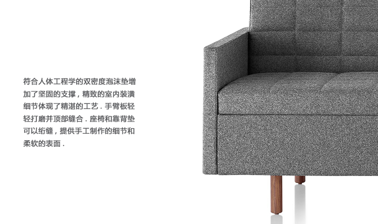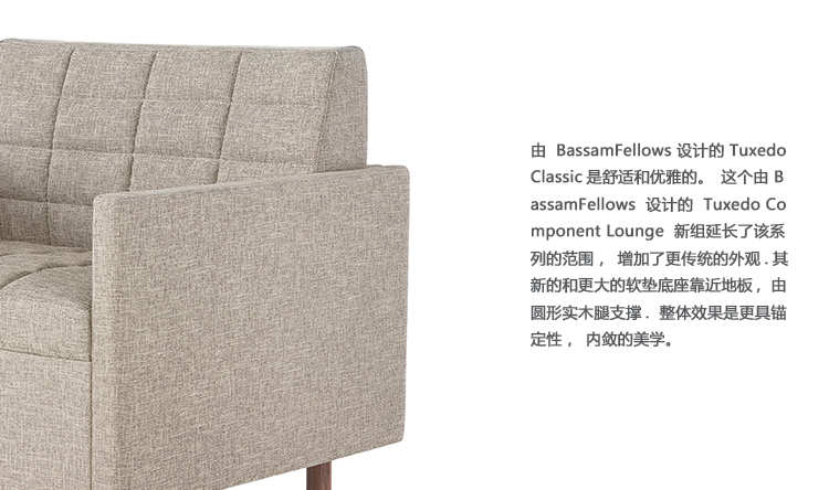 Tuxedo休闲座椅由细窄的钢腿提供支撑,金属支腿有6种饰面可选,靠背和(可选)扶手形成一条水平横线,让座椅的整个线条轮廓看起来十分低沉、流畅。超薄、双层泡沫衬垫外面包裹清新定制的装饰,让沙发看起来更加轻巧。每款装饰系列都包括有绗缝或无绗缝两种选项。