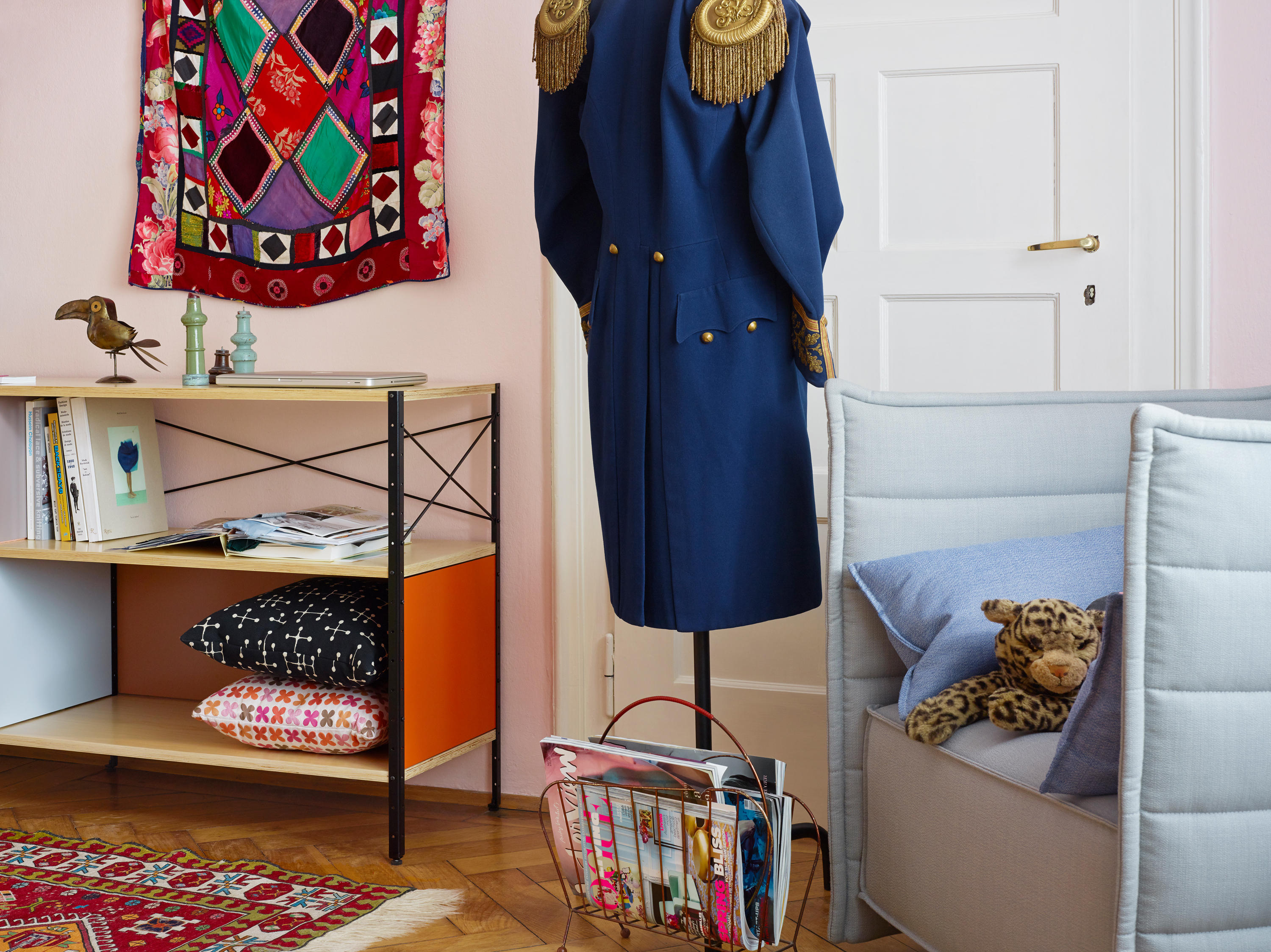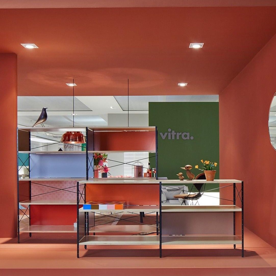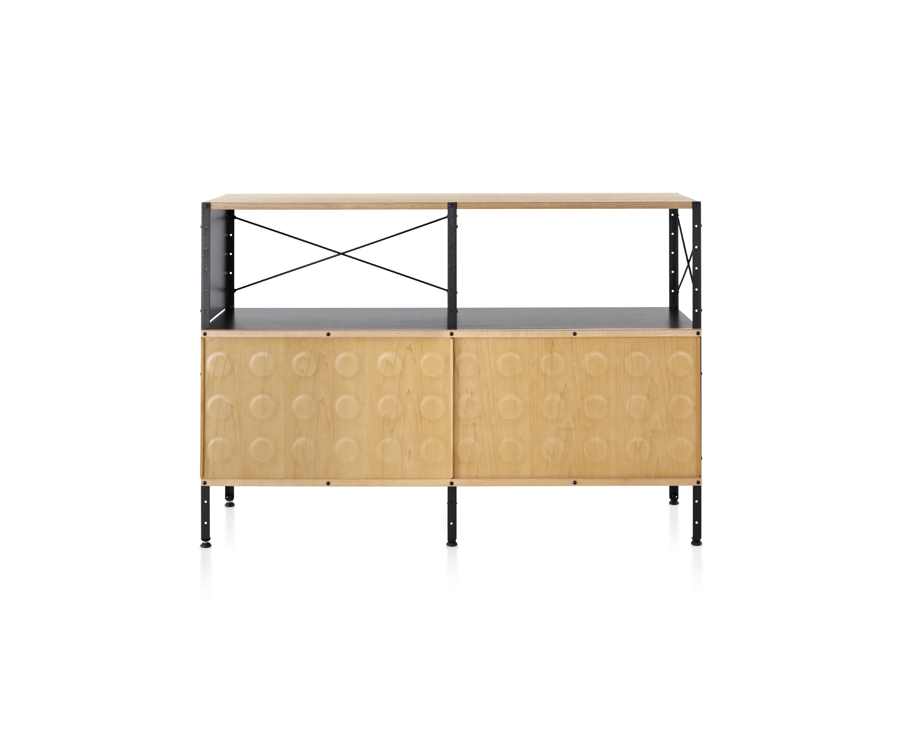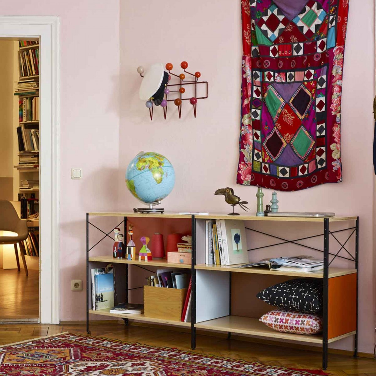 Eames存储单元由五种配置和四种大小的箱子、橱柜和抽屉组成。立柱、交叉支撑板和穿孔板要么是镀锌的,要么是黑色的;橱柜的正面是凹凸不平的胶合板;抽屉的正面和架子是模制的胶合板;箱体侧面和背面的面板是涂硬木的。可供您选择两种配色方案:中性色或亮色。