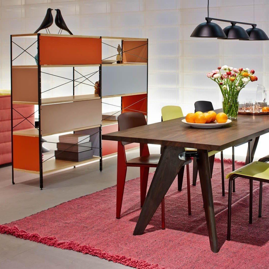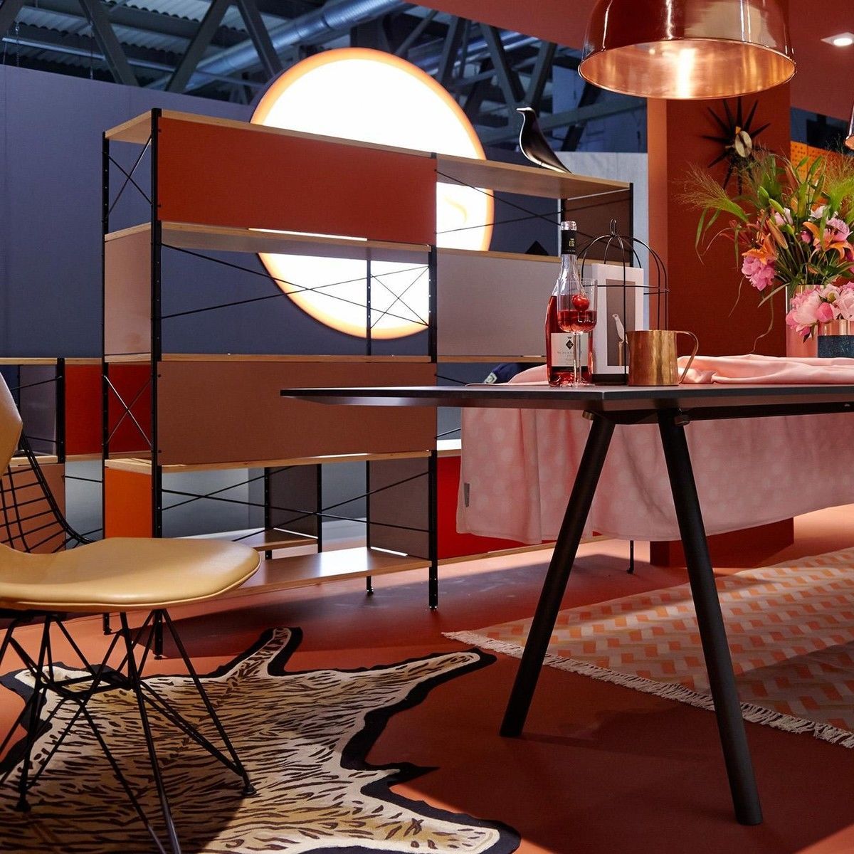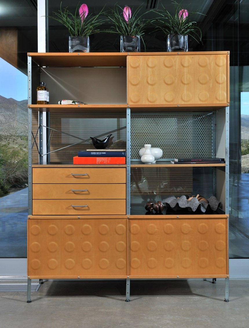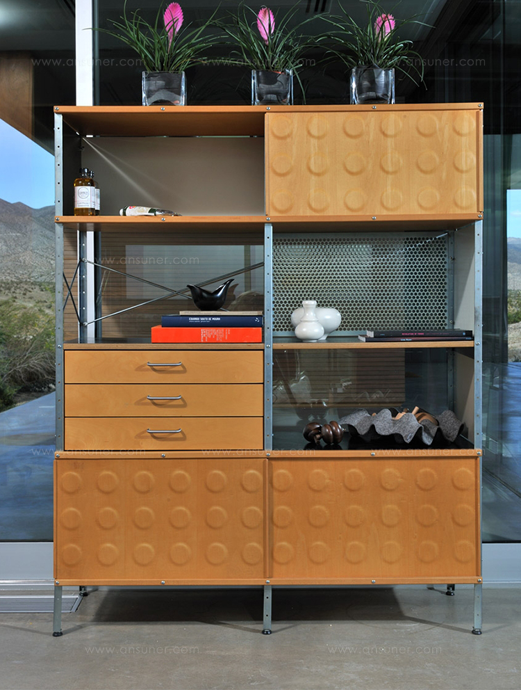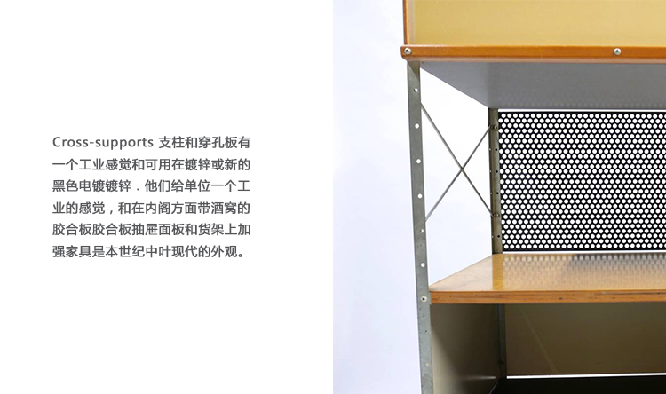 Eames存储单元由五种配置和四种大小的箱子、橱柜和抽屉组成。立柱、交叉支撑板和穿孔板要么是镀锌的,要么是黑色的;橱柜的正面是凹凸不平的胶合板;抽屉的正面和架子是模制的胶合板;箱体侧面和背面的面板是涂硬木的。可供您选择两种配色方案:中性色或亮色。