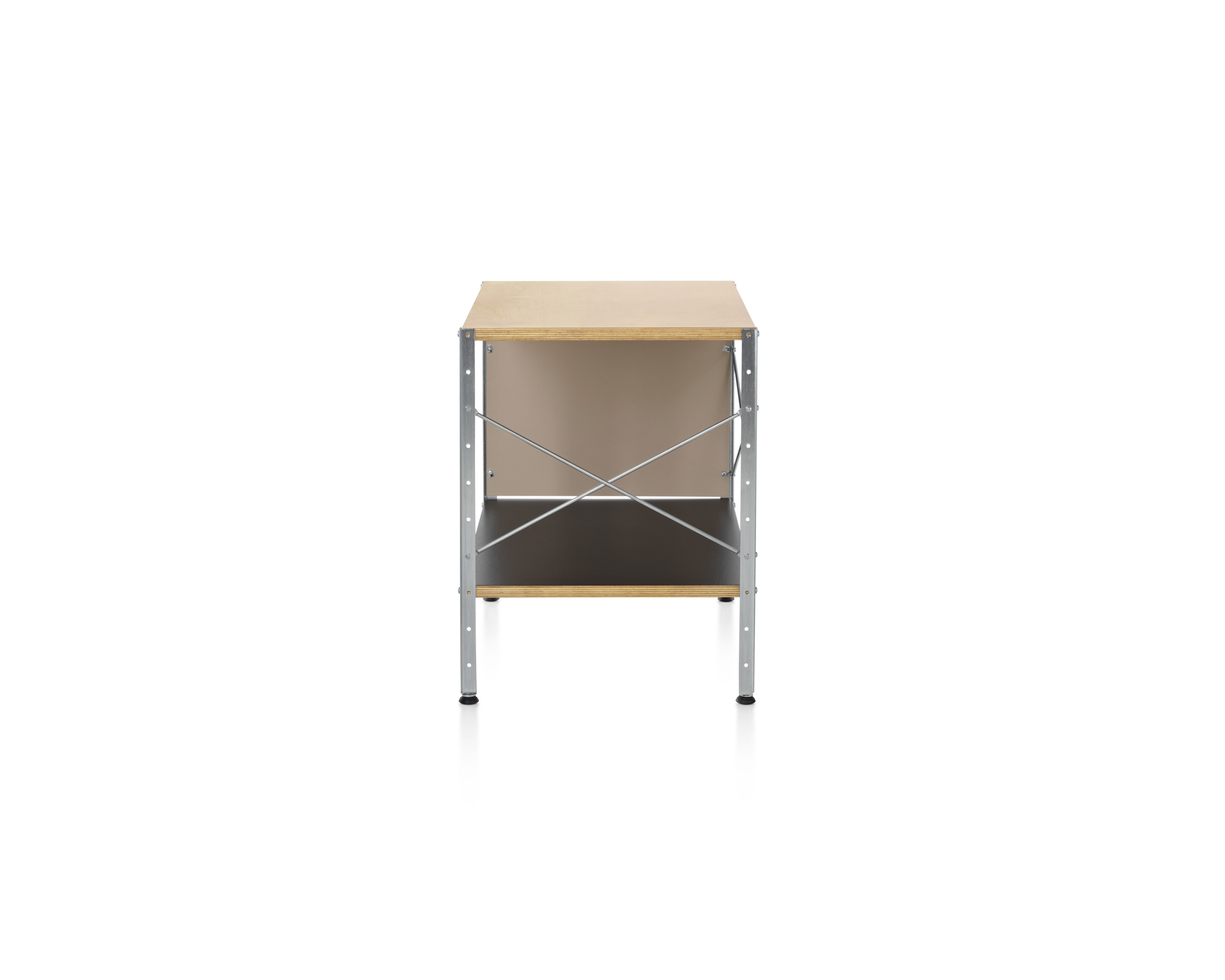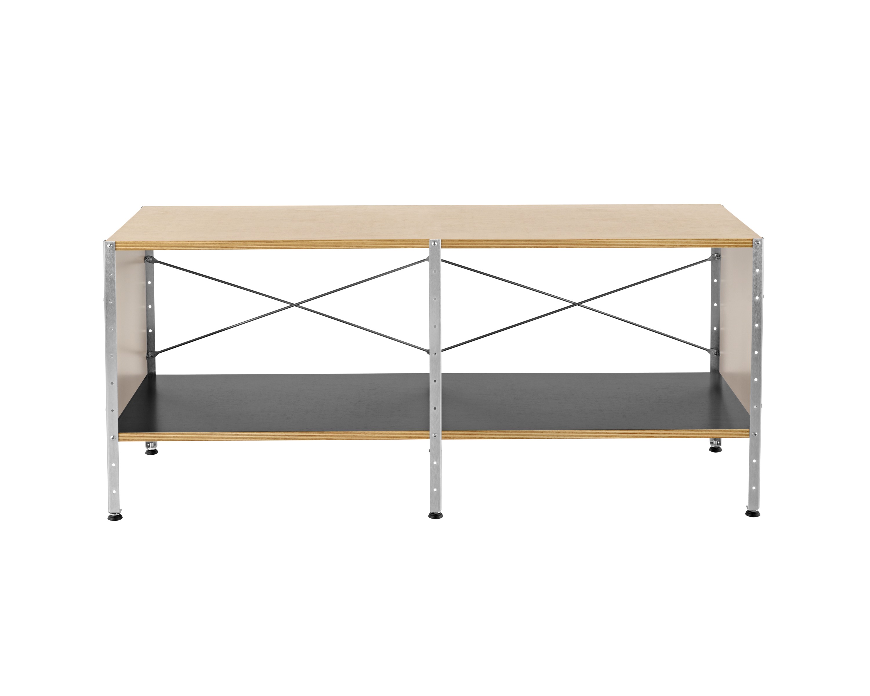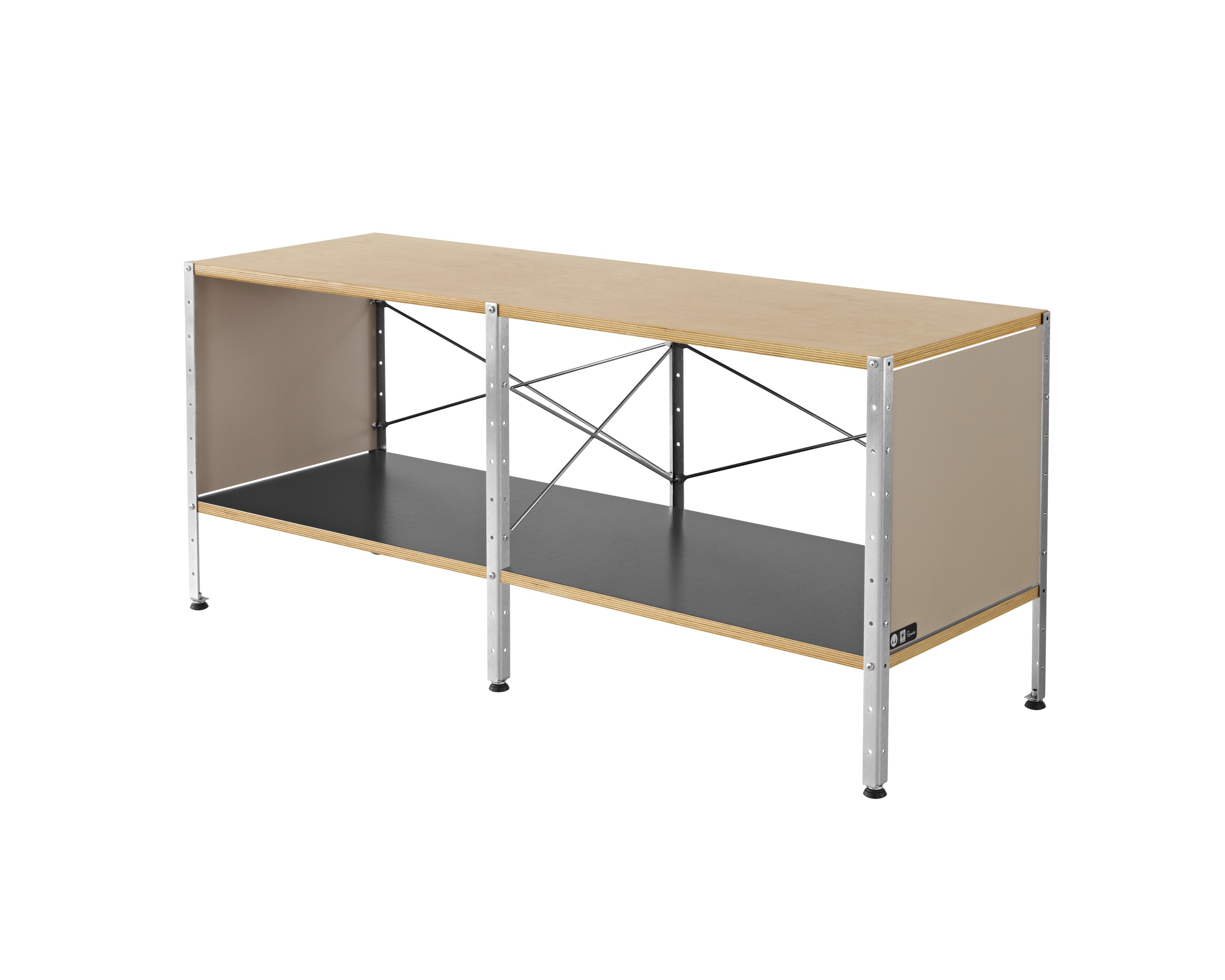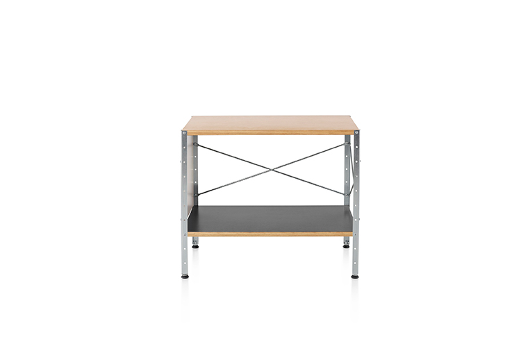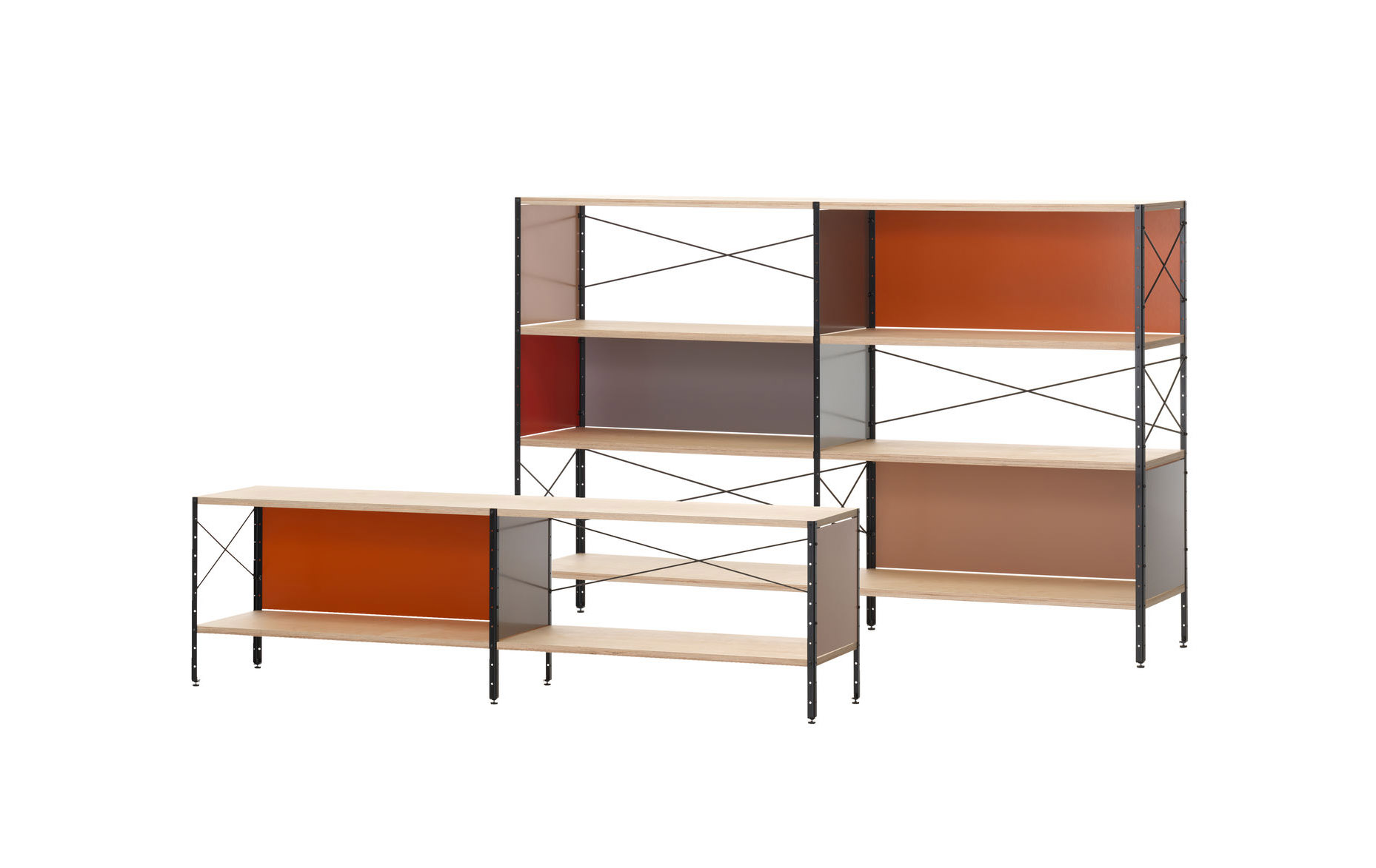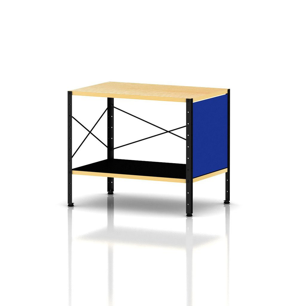 Eames存储单元由五种配置和四种大小的箱子、橱柜和抽屉组成。立柱、交叉支撑板和穿孔板要么是镀锌的,要么是黑色的;橱柜的正面是凹凸不平的胶合板;抽屉的正面和架子是模制的胶合板;箱体侧面和背面的面板是涂硬木的。可供您选择两种配色方案:中性色或亮色。