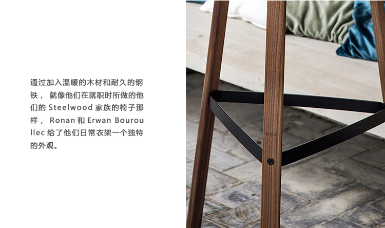 通过加入温暖的木材和耐久的钢铁,就像他们在就职时所做的他们的Steelwood家族的椅子那样,Ronan和Erwan Bouroullec给了他们日常衣架一个独特的外观。有多种涂漆金属接头和天然或涂漆的木腿可供选择,大衣架设计为随着年龄的增长而继续持久,这个设计成为家庭,办公室或家庭的一个受欢迎的补充任何需要挂东西的地方。
