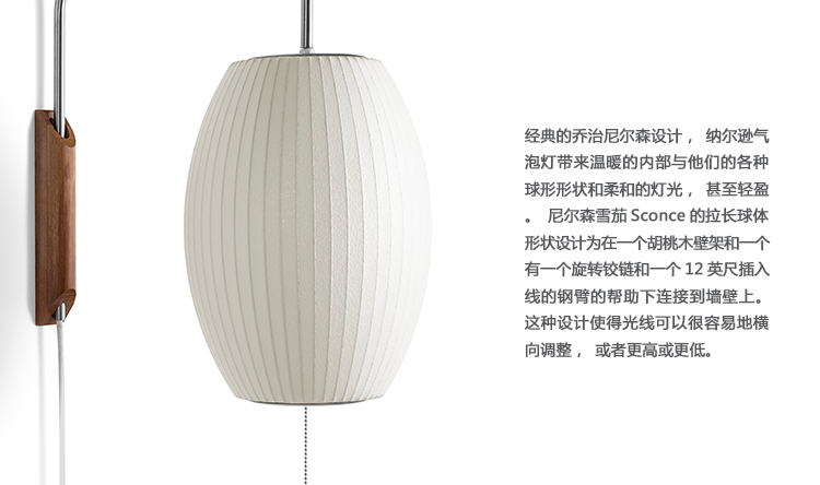 经典的乔治尼尔森设计,纳尔逊气泡灯带来温暖的内部与他们的各种球形形状和柔和的灯光,甚至轻盈。尼尔森雪茄Sconce的拉长球体形状设计为在一个胡桃木壁架和一个有一个旋转铰链和一个12英尺插入线的钢臂的帮助下连接到墙壁上。这种设计使得光线可以很容易地横向调整,或者更高或更低。纳尔逊在1952年设计了泡泡灯,当时他偶然发现了一套瑞典的吊灯,想为自己的办公室添置一套。当时,他们高昂的价格促使纳尔逊设计了自己的产品。