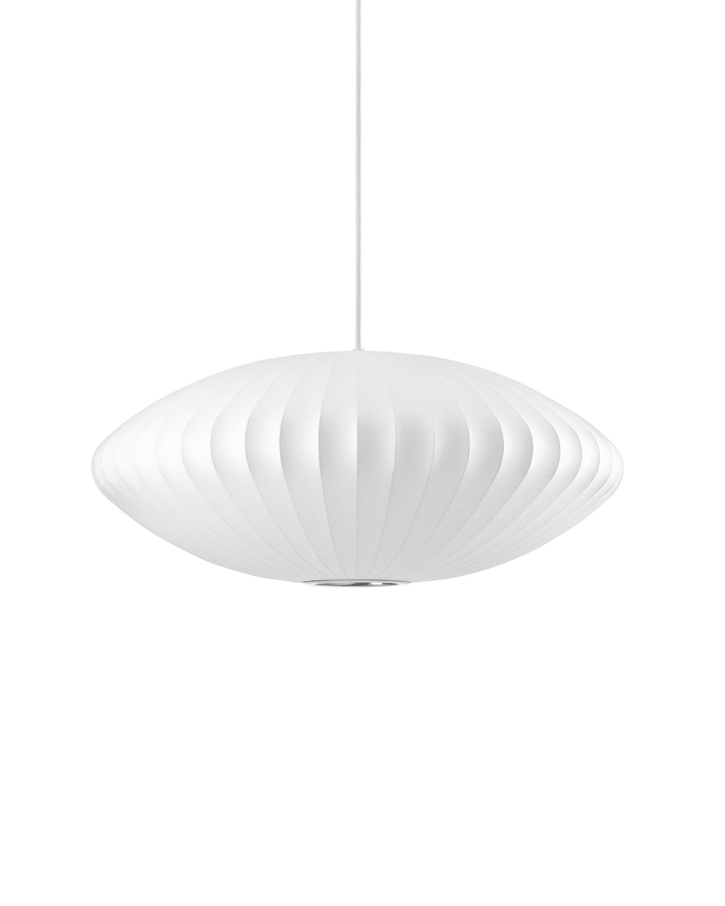 Nelson气泡灯是一组形形色色、具有球状轮廓的灯具,能散发出均匀柔和的光线。Nelson Saucer Bubble Pendant杯托型气泡吊灯宽大的形状及其不锈钢的下层结构能给人带来柔和流动的线条感,造型可爱,光线宜人,适合任何室内风格。本款吊灯有小号、中号、大号和加大号几种不同规格。George Nelson于1952年设计了这个系列的灯具,当时他偶然发现了一款瑞典吊灯,打算买回去放到自己办公室里使用。但那款吊灯高昂的价格让他犹豫了,却让他萌生出自己设计一个气泡灯系列的念头来。