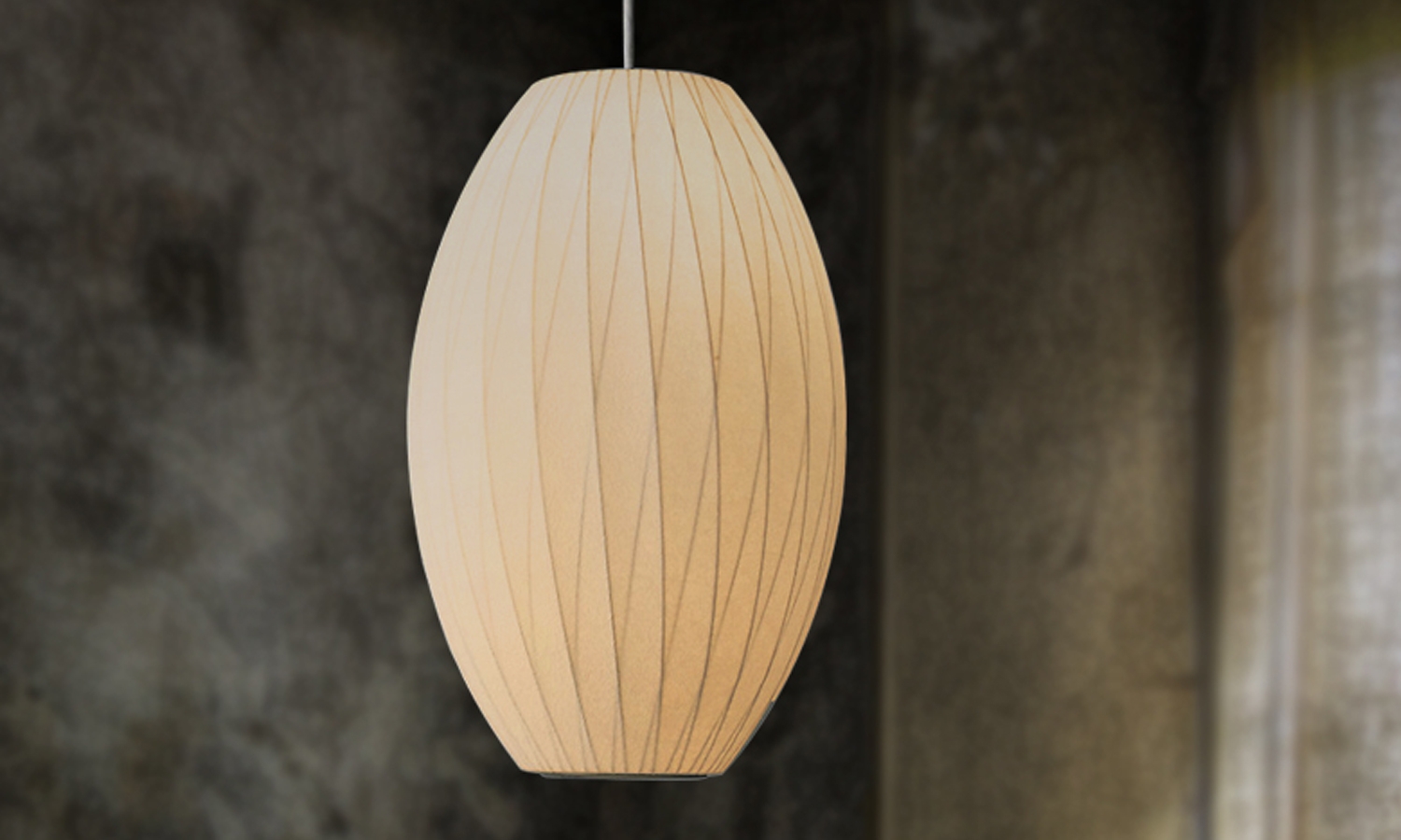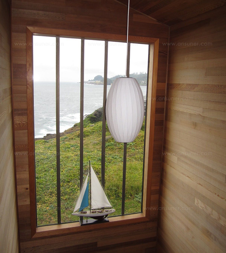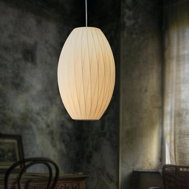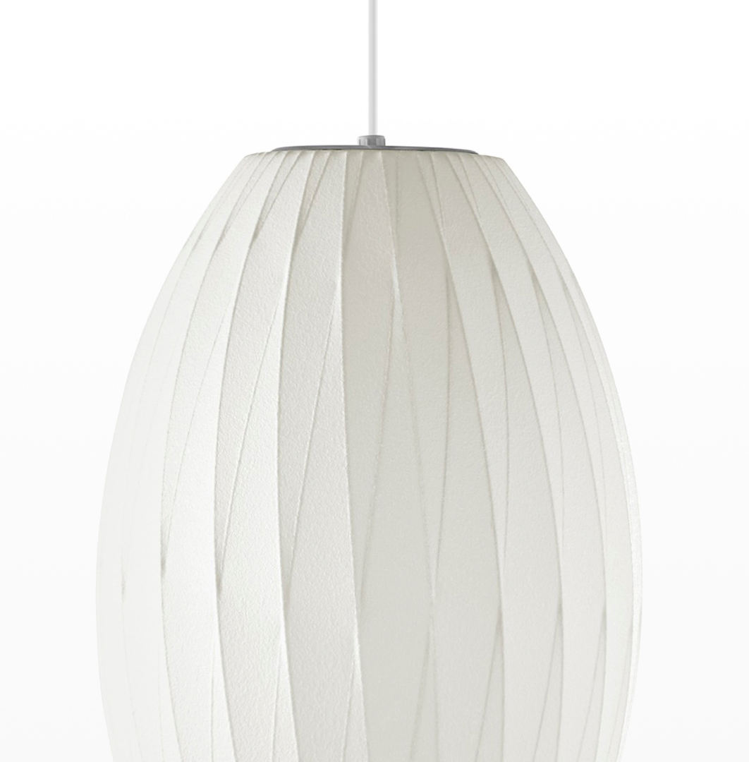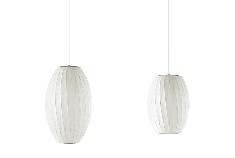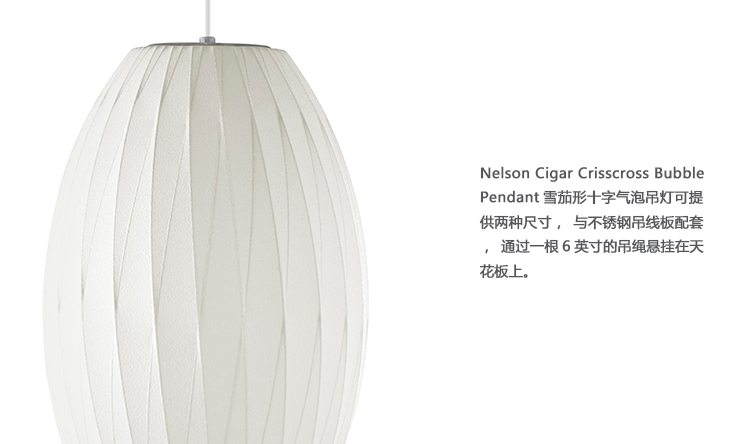 Nelson Cigar Crisscross Bubble Pendant雪茄形十字气泡吊灯可提供两种尺寸,与不锈钢吊线板配套,通过一根6英寸的吊绳悬挂在天花板上。George Nelson最初于1952年设计出气泡灯,当时他偶然发现了一款瑞典吊灯,打算买回去放到自己办公室里使用。但那款吊灯高昂的价格让他犹豫了,于是决定自行设计。其结果就是一系列简单的球状外形面世了,比如圆圆的苹果、宽大的杯托和造型优美的梨,等等。