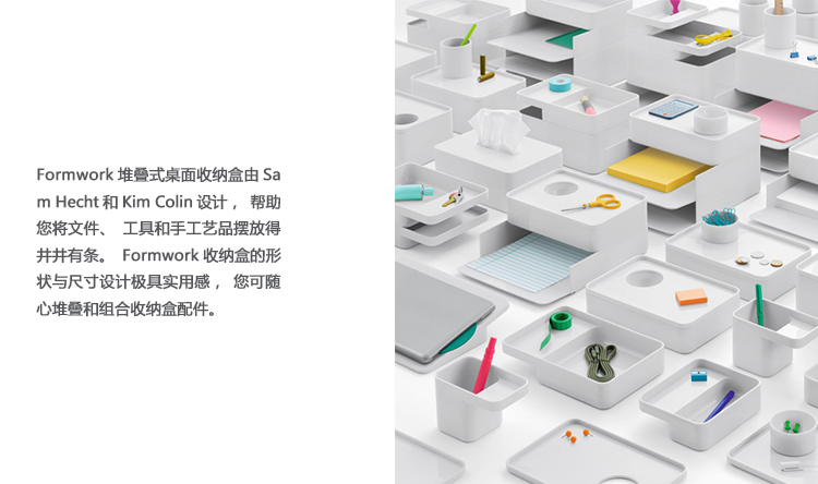 Sam Hecht和Kim Colin在设计Formwork及其大号和小号托盘之时充分考虑到了我们生活中及桌面上随处可见的物品。在系列托盘的设计上,设计师呈现出了一个悬臂式横档,以便能够按照实用性归置物品——因此,部分物品触手可及,而其他则置于背后稍远处。