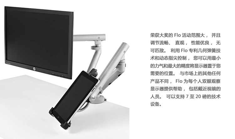 屡获殊荣的Flo的运动范围和流畅,直观的调整是无与伦比的。 其专利的几何弹簧技术和动态指尖控制使您可以轻松地将屏幕精确地放置在您想要的位置,并且最大限度地提高精度。 与市场上的任何其他产品不同,它支持每个人的眼睛,即使是那些使用渐进镜片的人。 支持7至20磅的技术。