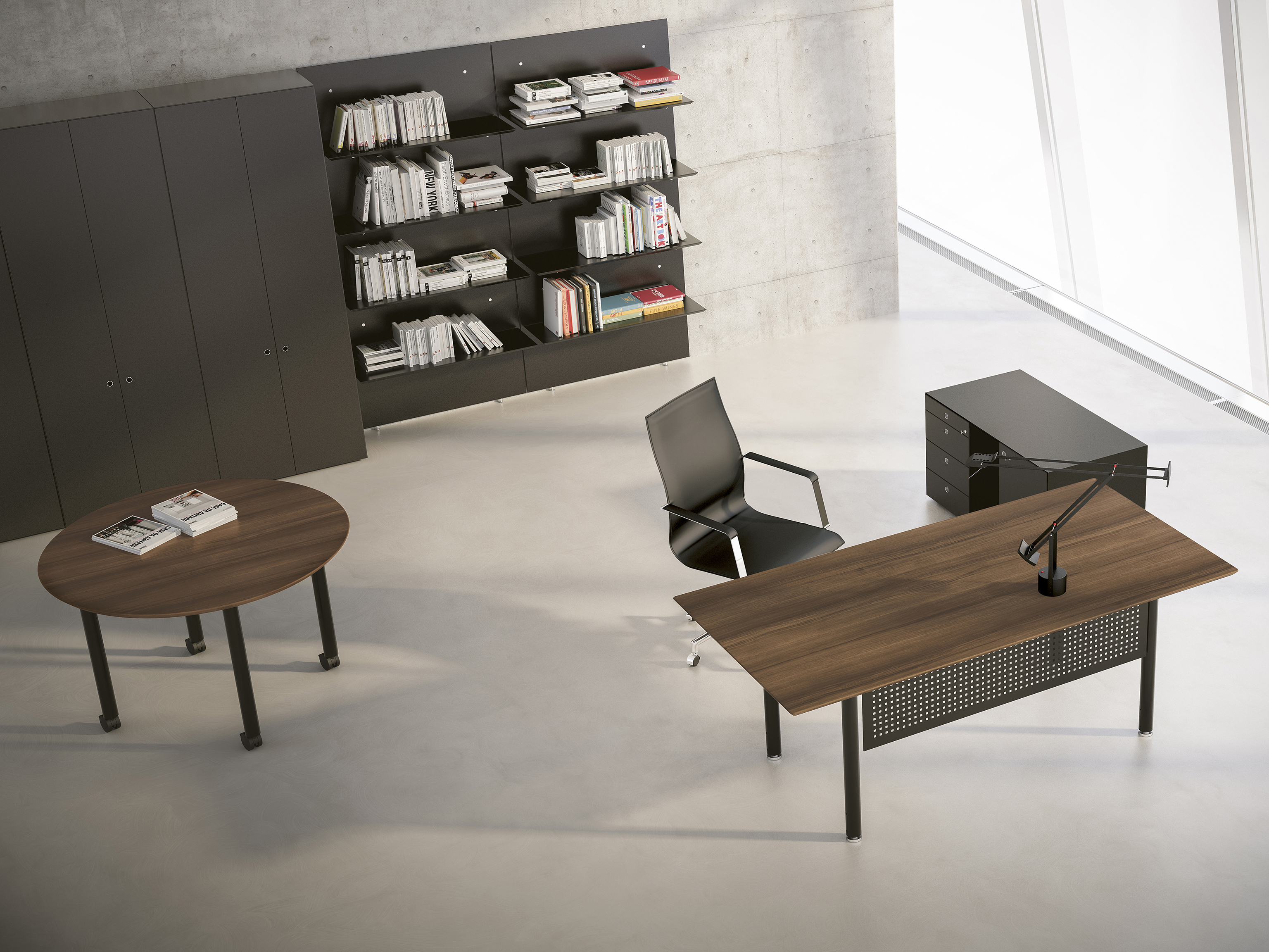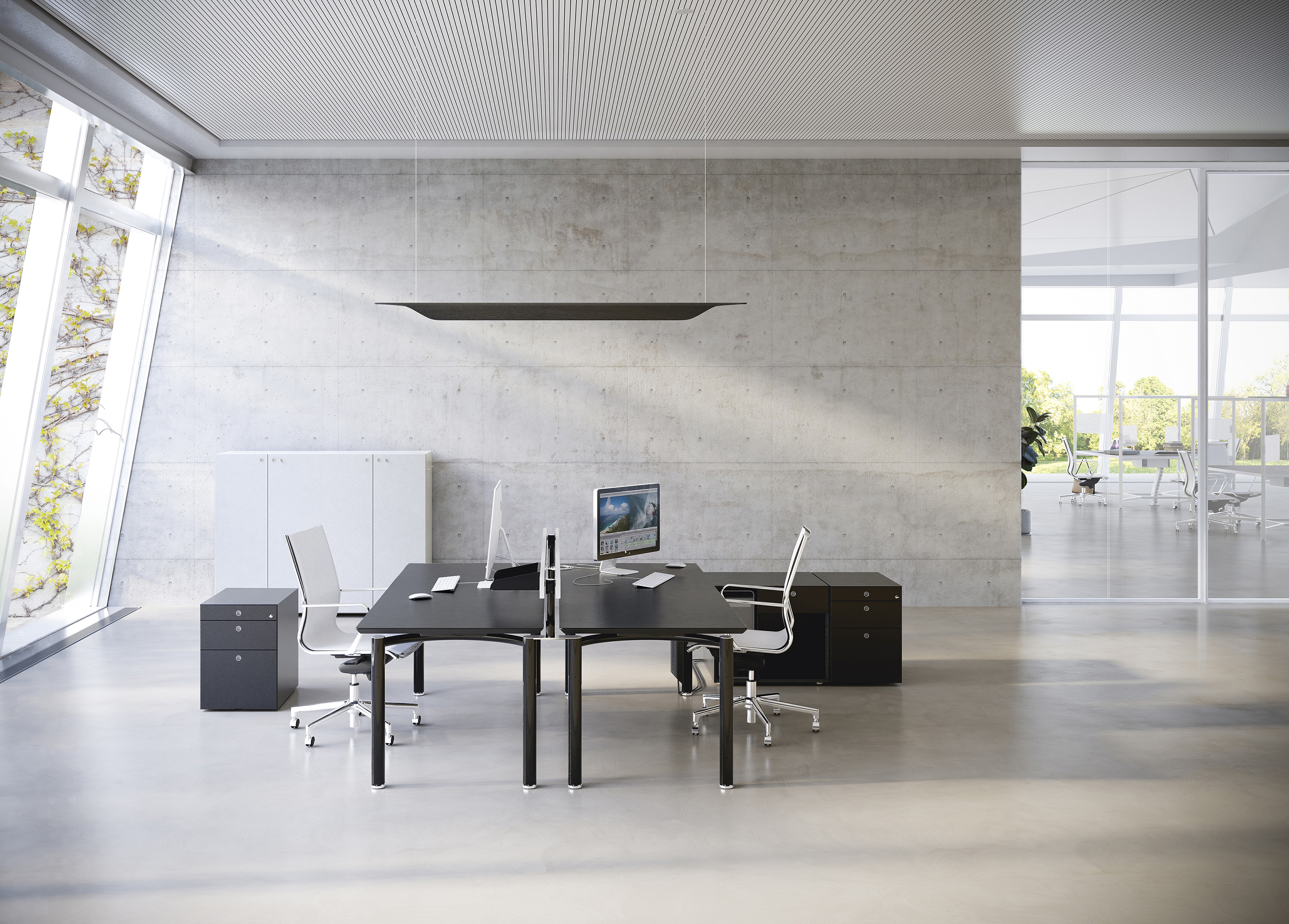 干净的几何线条使实用的人体工学家具具有流动性和优雅感。可用表面处理:白雪公主,石墨灰色,迷雾灰色,黑色,银色和胡桃木,营造出严谨而轻巧的风格。