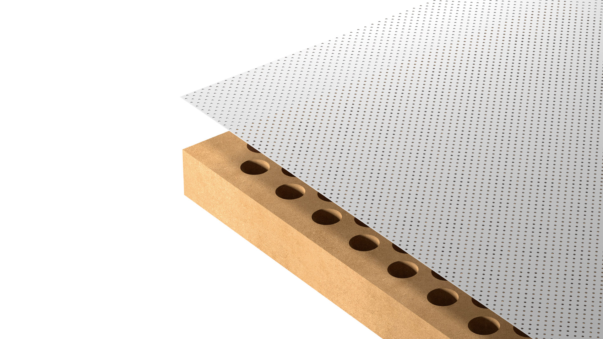 高品质吸音板,具有非常干净的线条,并包括一个与Microslim层压板粘合的MDF板。MDF支架的厚度为16毫米,每16毫米设置8毫米的孔,每平方米形成约8000个回音室。每隔2毫米就设置一个0.5毫米的Microslim层压板钻孔孔,使声音穿透面板的表面。除了确保均匀的孔间距外,打孔的纳米孔系统还避免了典型的激光穿孔烧伤风险。