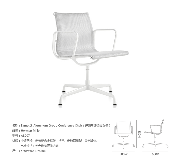 Charles与RayEames夫妇是20世纪最有影响力的设计师,卓越的设计涵盖了家具、建筑、影像与平面设计。他们从二次世界大战中美国海军的实验计画中学习经验并发展可谓是现今工业中使用模铸胶合版的先锋,这对设计界的超级夫妇档自1940年参与了由MOMA举办的有机家具设计大赛,自今已有近百件他们的作品被各大博物馆所永久典藏。 Eames® Soft Pad Side Chair(伊姆斯软包会议椅)是夫妻俩1958年设计的,是在全铝系列的基础上发展的另一系列Eames产品。舒适系列在全铝的椅架上增加了皮革制的柔软坐垫和靠背,高级铝合金制作,压模四星脚,可旋转。背垫和坐垫,采用西皮,具有透气性强,内部填充高密度定型绵,不易变形,不老化,依人体坐姿,符合人体工学,耐水及对人体无害等优势。椅子扶手选用优质电镀铝合金扶手,手感舒适,永久不生锈。转椅底盘为多功能底盘,可以保护使用者长时间坐用腿部健康,且作为高度可多定位调节。气压棒采用的气杆是正规厂家出产的外贸气杆,每一根气杆都有钢印,经过严格SGS检测的才可出厂,旋转、升降自如基本无声响,使用寿命长,可承受250kg,可升降数万次,将椅面调至与膝盖同高时,使用者坐下后双脚跟可垂直平放于地上,且大腿与地面平行,最符合人体工学理论,使用者长期久坐,也不想疲惫。办公椅脚为铝合金材质永久不生锈、承受能力强,安全更放心。椅子脚轮采用优质电镀片脚轮,耐用而美观,可以随意变换位置,贴心更方便,具有防震及防松脱,让椅子的安全性能更加可靠。