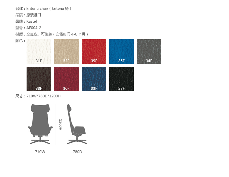 Kastel是一个在室内装饰领域极具影响力的公司,该公司具备高水平的综合生产能力,是一个充满活力的公司。Kastel公司产品多种多样,包括办公座椅,社区座椅和家庭座椅等等。Kastel在对人体工程学进行深刻研究之后,制定了现在的生产线,产品的设计以舒适为主,在生产过程中每一步都严格遵循这一宗旨,为客户提供高性能的产品,满足客户对舒适的基本要求。这也是Kastel公司的经营理念。kimera系列办公椅采用全真皮扪面、可同步升降、旋转、可倾仰锁定,符合人体工学,高档舒适,是办公,会议的理想选择。