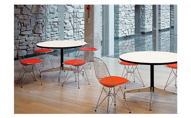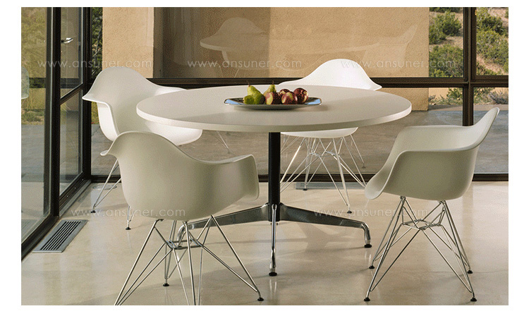 1964 年,著名的夫妻设计师Charles和Ray Eames设计了Eames Round Table(伊姆斯圆桌),这张桌子有一个单一的分块基础,构建的模块化单元,可以支持不同的长度和宽度的顶部。简单倾斜的基础设计产生的强度和多功能性使之能够大范围进行使用。50多年来,他们设计的这张桌子一直把优雅精致带到人们聚在一起的地方。他们的形状、颜色和尺寸,Eames Round Table(伊姆斯圆桌)对于那些欣赏耐久性、功能性和简单的美的人来说,一直是受欢迎的选择。其独一无二的增效,在家具行业中产生了全新的面貌。时尚精致,玩转性的功能,优美的造型,古朴而精美,这是就是永远的“伊姆斯之美”。