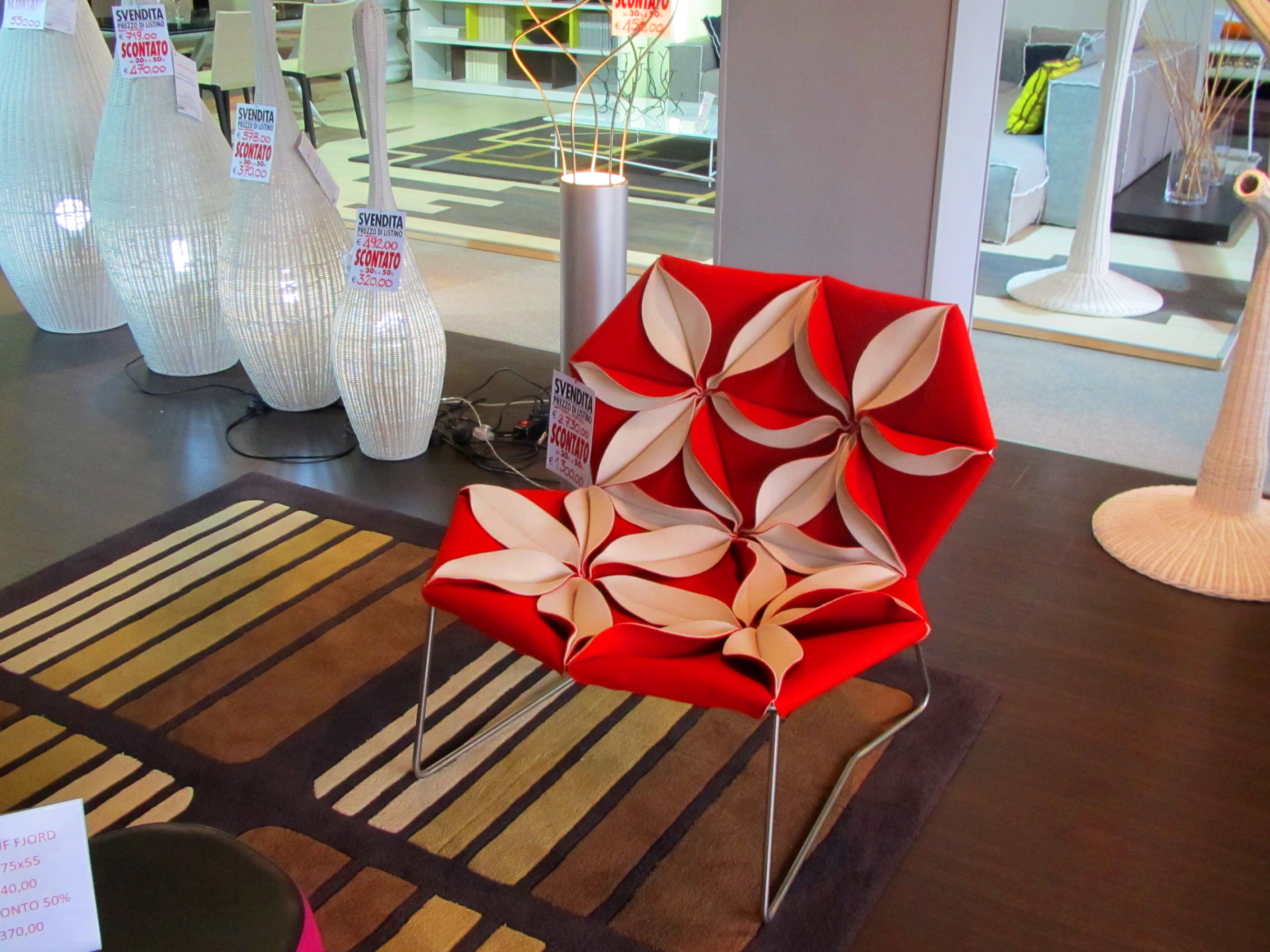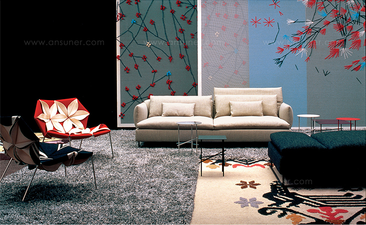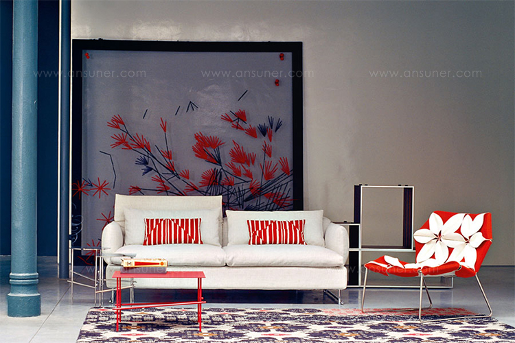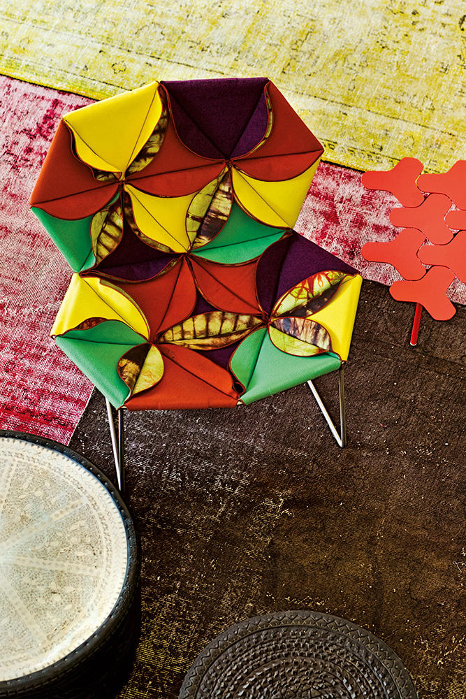 Antibodi 是 Patricia Urquiola 從一個花朵盛開的概念所創作的椅子,蜂窩式三角形花瓣串連縫製而成花朵散播在椅面上,片片花瓣的外型和多層次的材料,衍伸出豐富的圖案。
