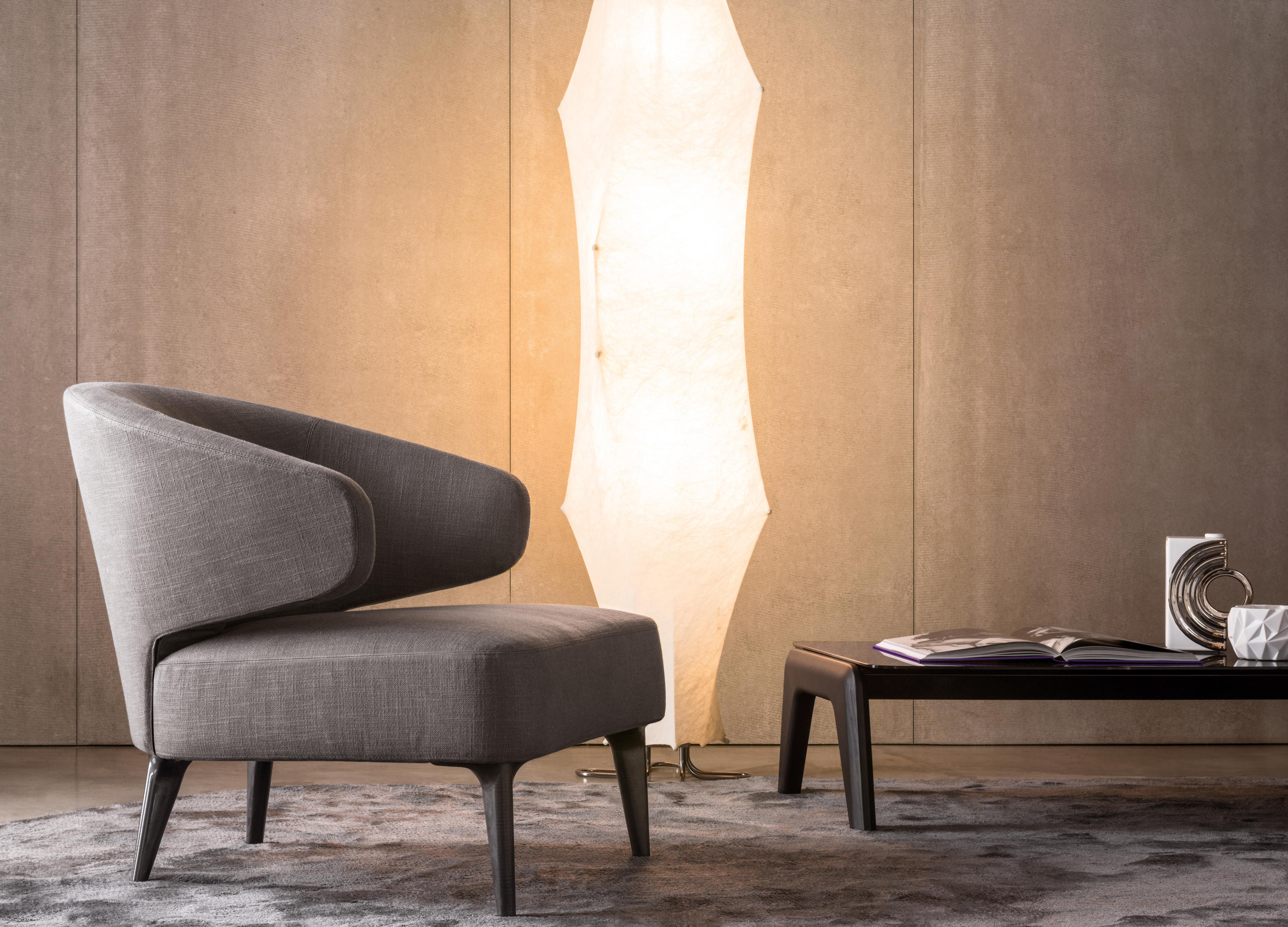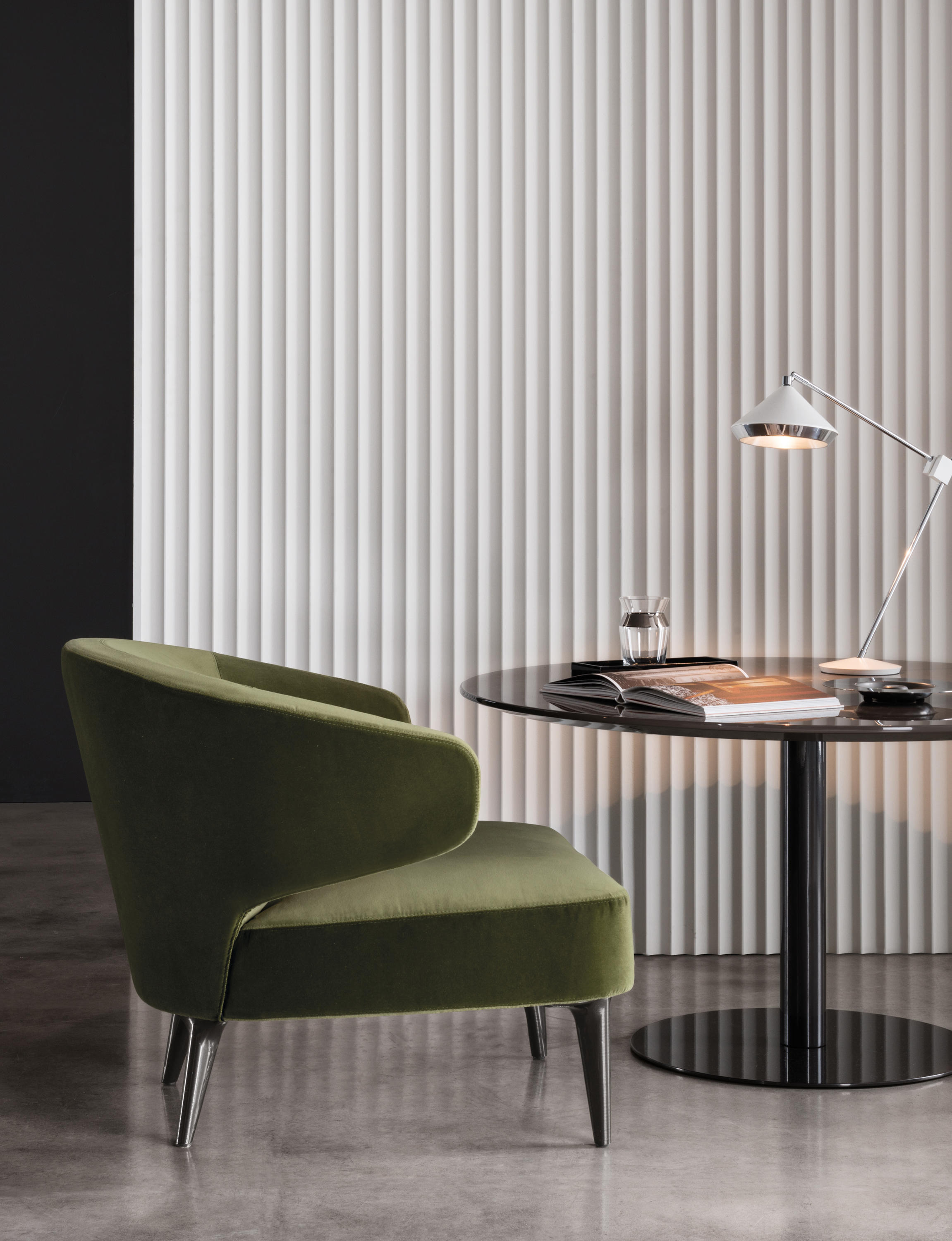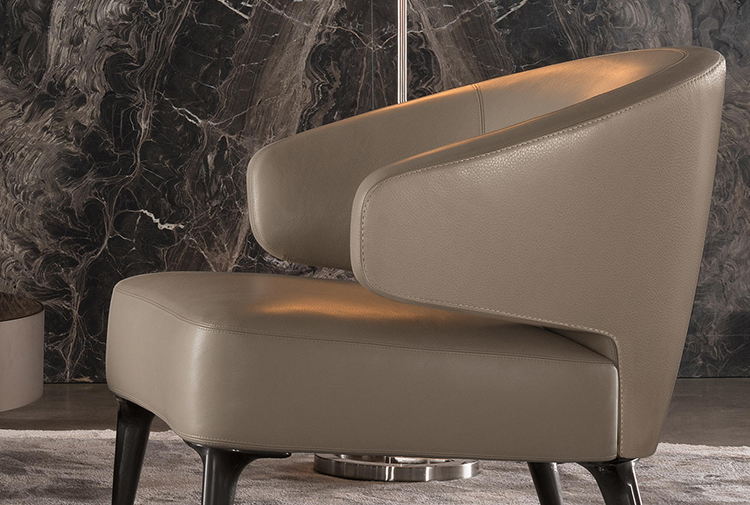 沙发的围裹式靠背特色十足,扶手线条与之完美呼应,以蓝灰色调呈现的压铸铝合金支脚尽展精致设计之美。