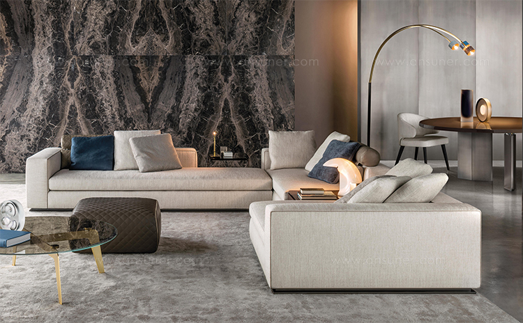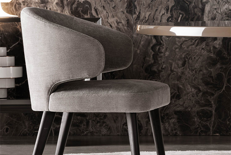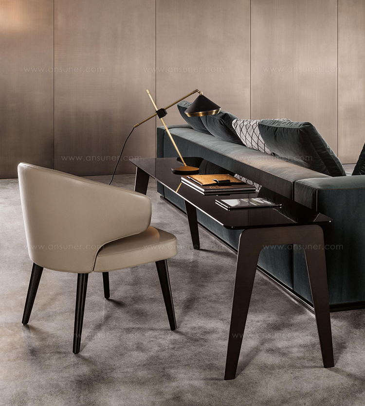沙发的围裹式靠背特色十足,扶手线条与之完美呼应,以蓝灰色调呈现的压铸铝合金支脚尽展精致设计之美。