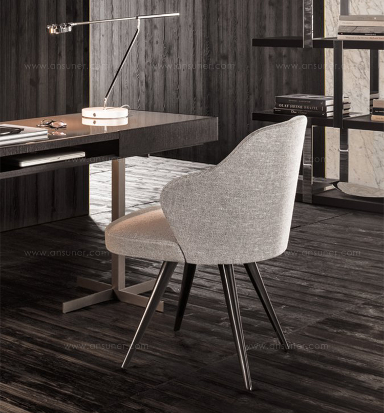 莱斯利“餐厅”小扶手椅展现出圆润而又迷人的造型和同名扶手椅的平衡比例。其特点在于冷模注塑而成的弧形靠背,搭配柔软的填充物。一丝不苟的覆面工艺打造完美的外观效果。Leslie “Dining”可以完全采用织布覆面或者皮革覆面,也可以选择混搭,靠背为织布覆面,坐垫则包覆皮革,体现两种材料之间的完美对比效果。Leslie “Dining” 小扶手椅有三种样式:Pewter色漆面的钢制固定基座,或是Pewter色漆面的压铸铝支撑腿。旋转式基座也采用Pewter色漆面的压铸铝支撑腿。
