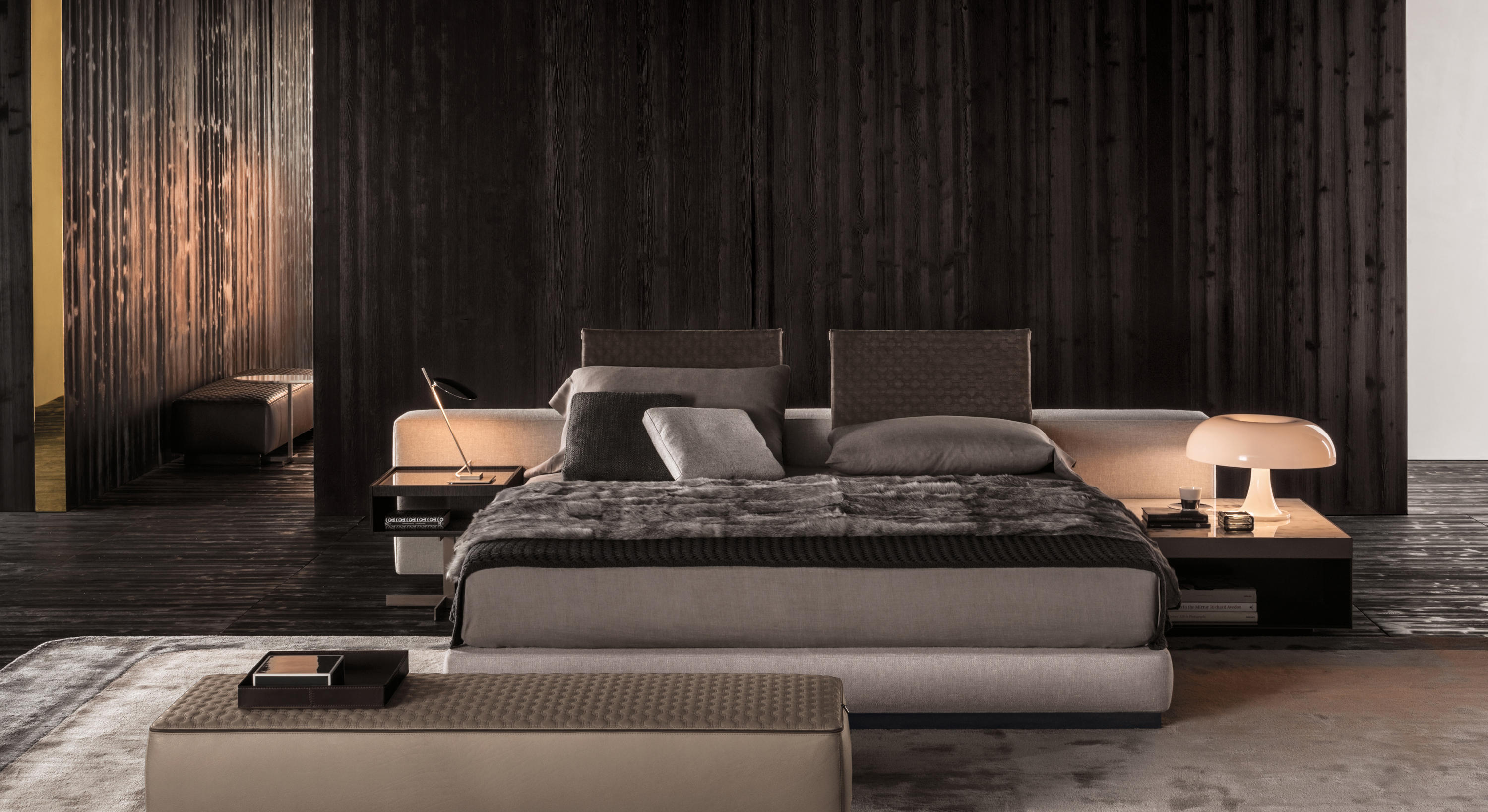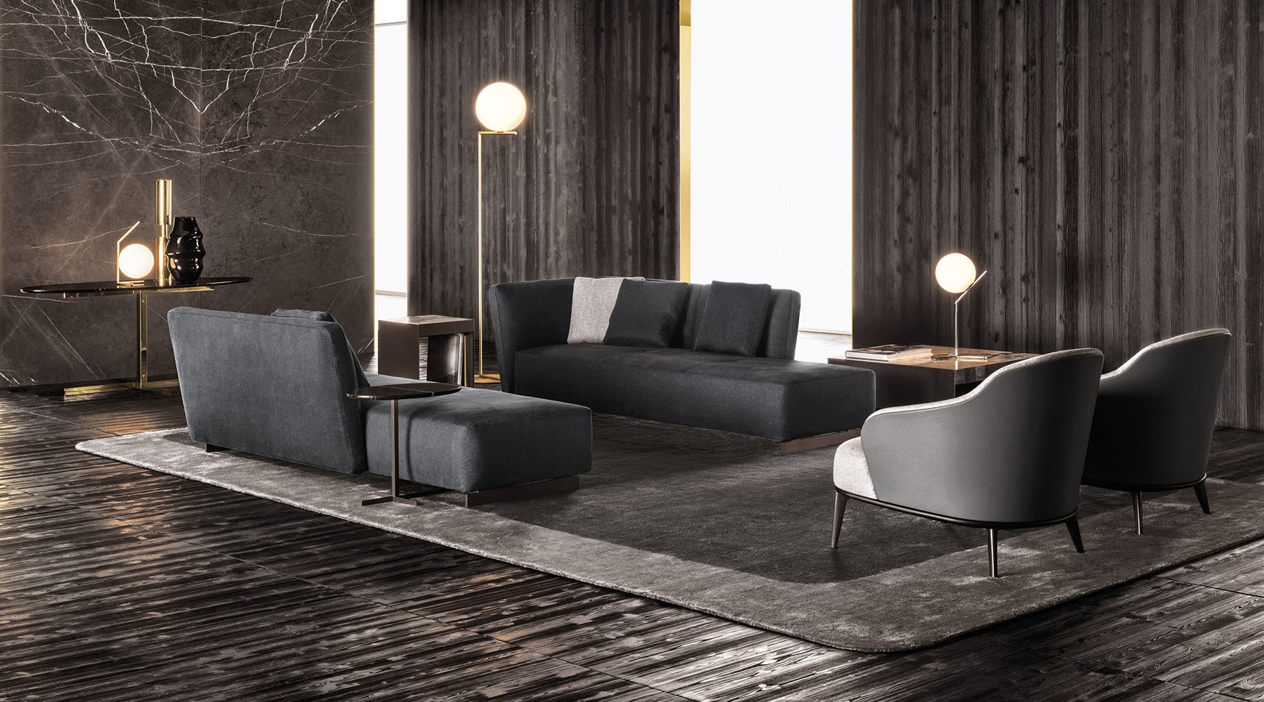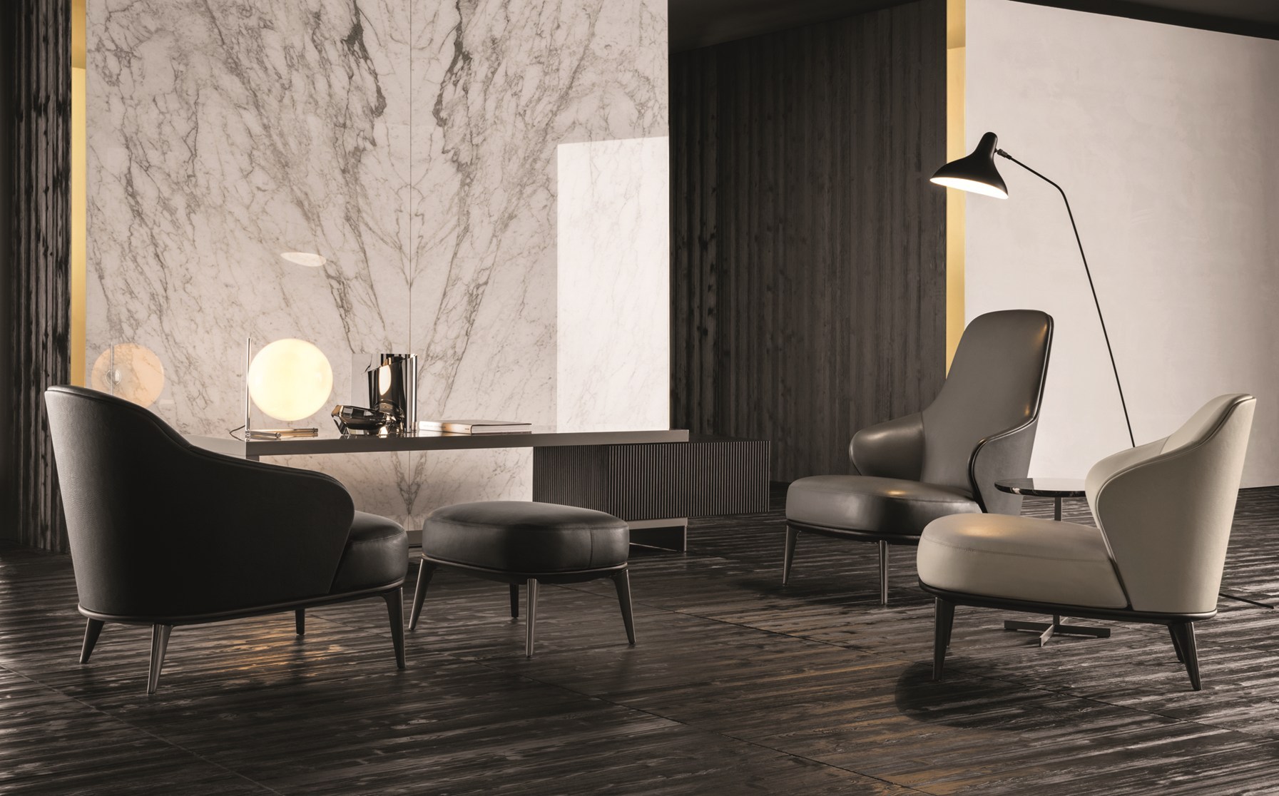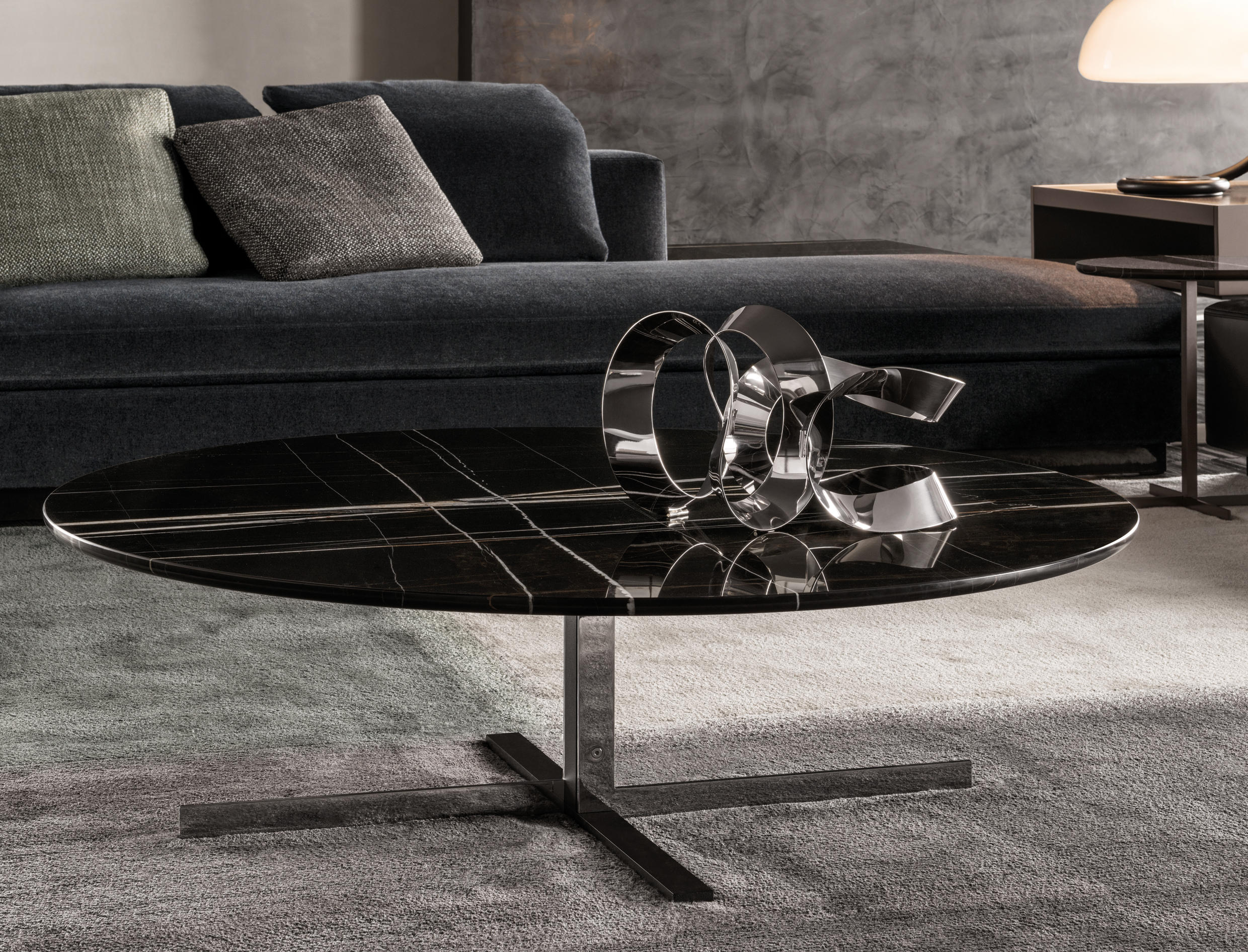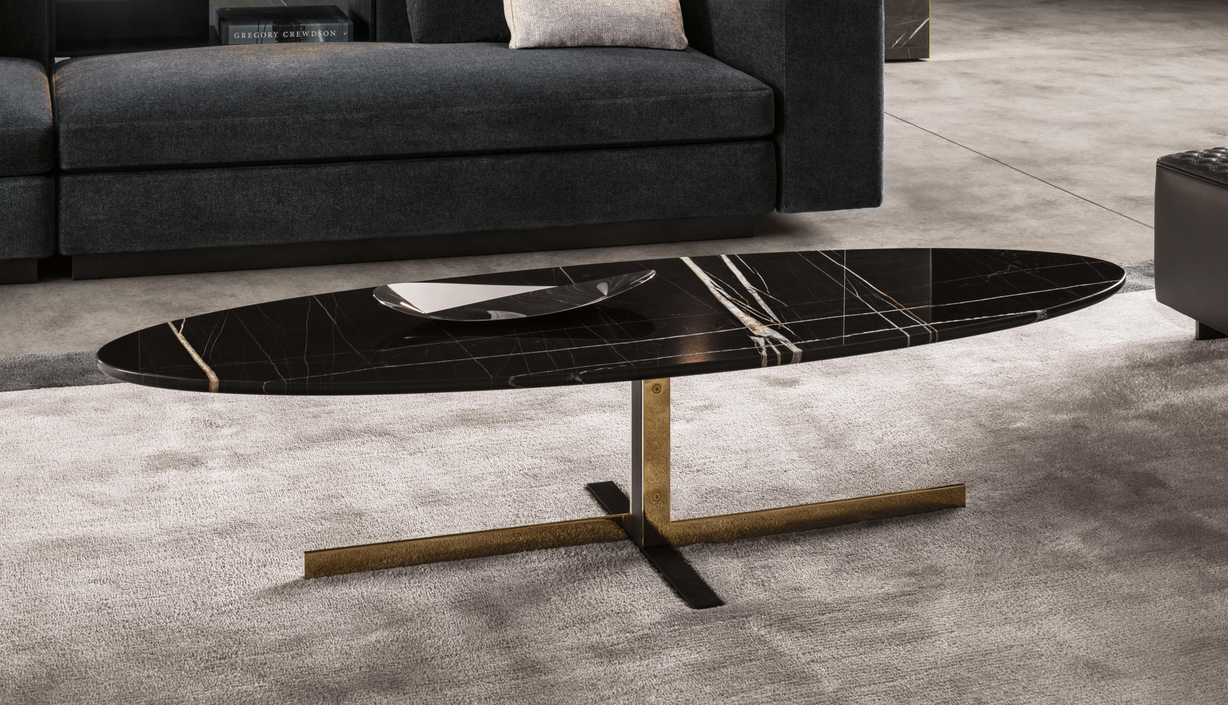 如果说Catlin边柜的设计崇尚简洁,那么材质的选择则旨在打造非凡的视觉和触觉效果。金属基座有着精致的十字形地面支撑腿,其中包括颇有趣味的组合:黑色压花搭配铬色或金色的抛光表面,打造出多种多样的风格。材料的搭配体现出非凡的优雅感,台面可以选择两种珍稀名贵的大理石,Arabescato Purple或Sahara Noir,两者都拥有抛光表面。