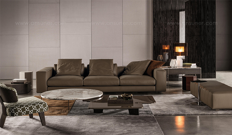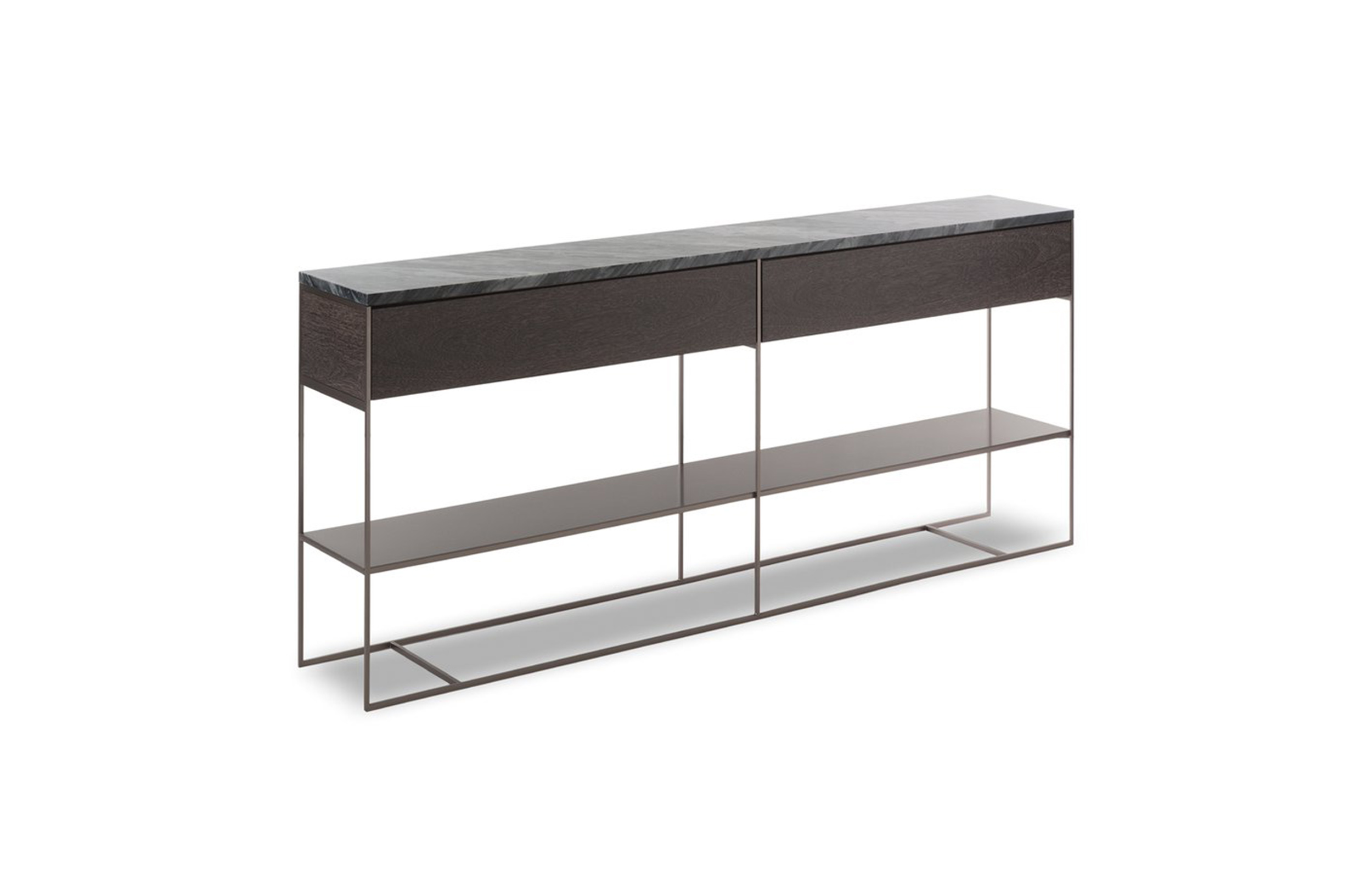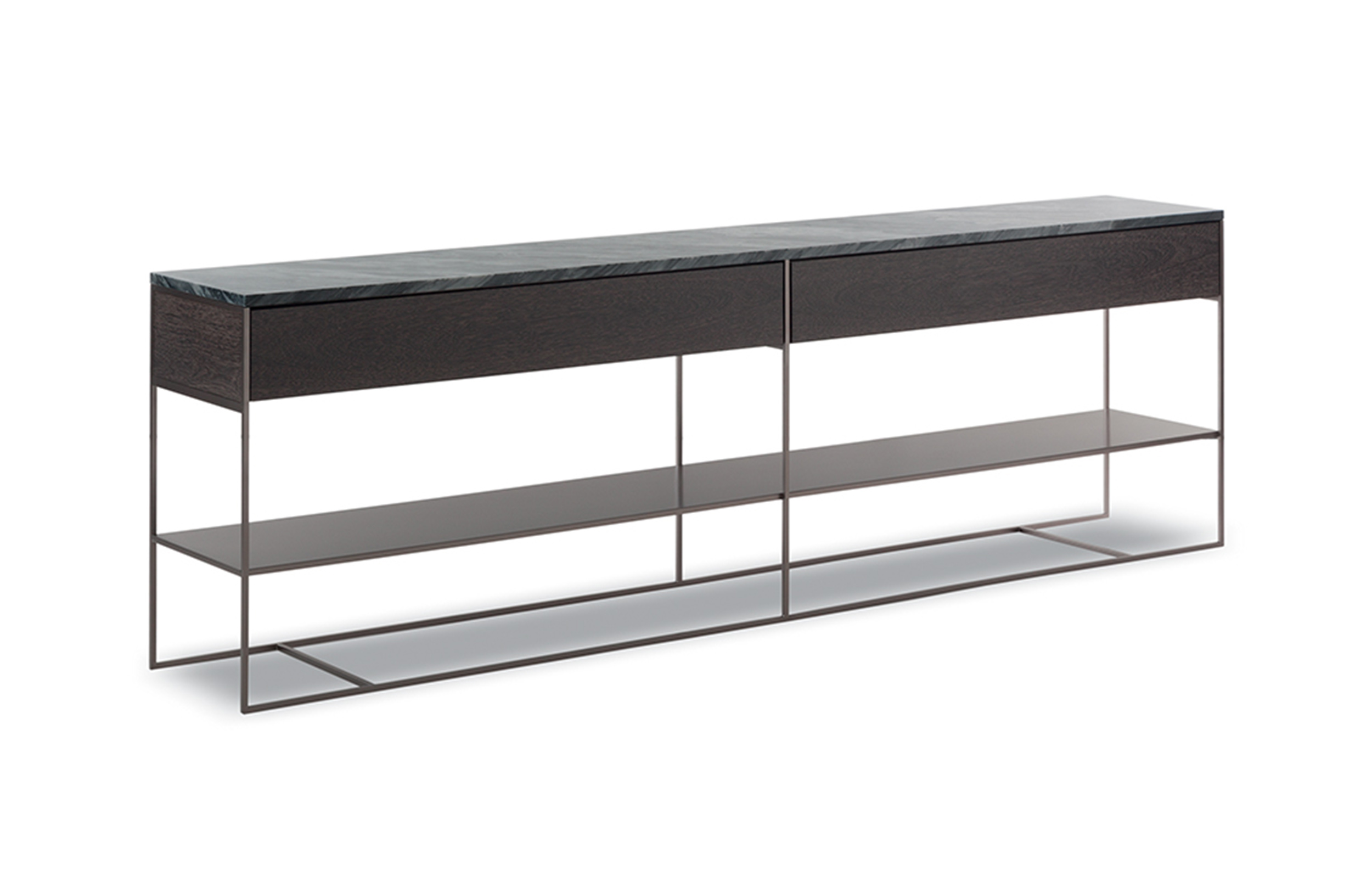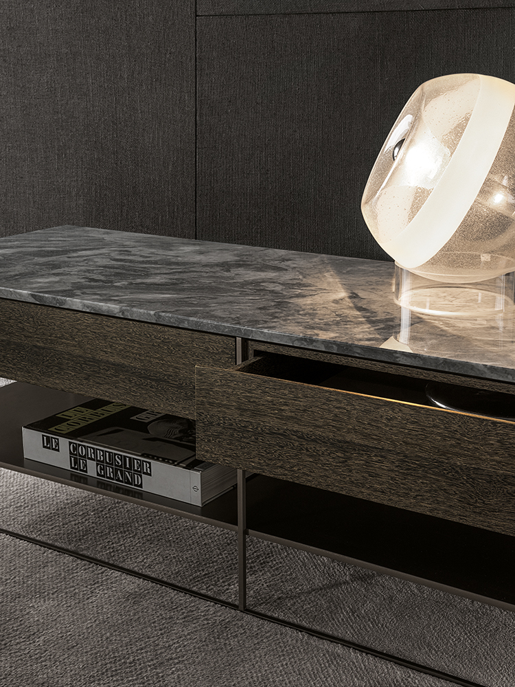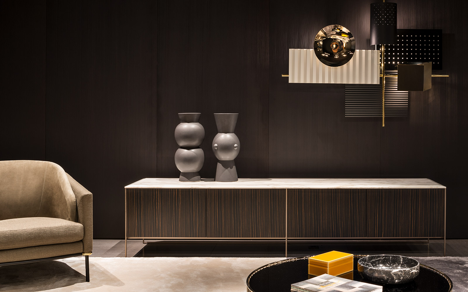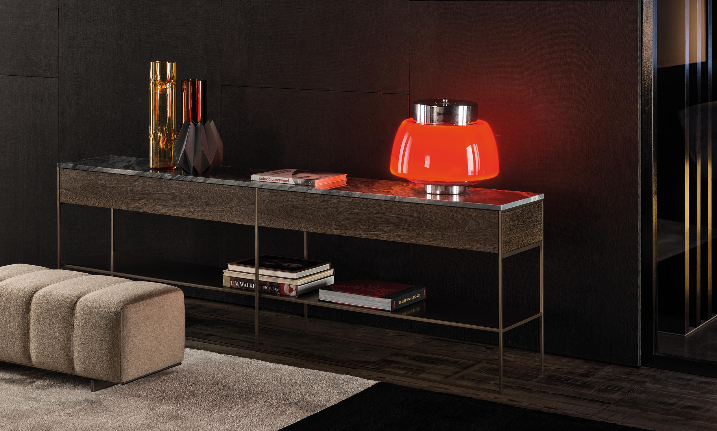 Calder家族有各种尺寸的边几和边桌,这一组全新的设计方案为其带来更为清新时尚的造型。铁架结构如今采用亚光浅铜色的表面。桌面也推出新版本:Sand色亮漆,米灰色的鲍迪豆木饰贴面,Bardiglio Nuvolato和Calacatta的大理石。中间层的桌面也为亚光浅铜漆面的金属。