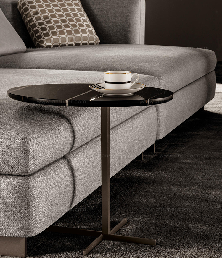 这款边几是专为搭配最新沙发座椅系列而设计的万能单品,基座为造型严谨的金属材质,台面为珍贵的大理石。Joy边几推出全新版本,采用椭圆形的大理石台面,与基座一同打造出不对称的效果,因而Joy “Jut Out”边几尤其适合搭配全新系列的沙发座椅。基座为十字形支撑,采用铜色金属材质。Joy “Jut Out”边几的台面采用圆边设计,还可以选用名贵的大理石材质:Arabescato Purple、Sahara Noir、Rosso Levanto,全部为抛光表面。