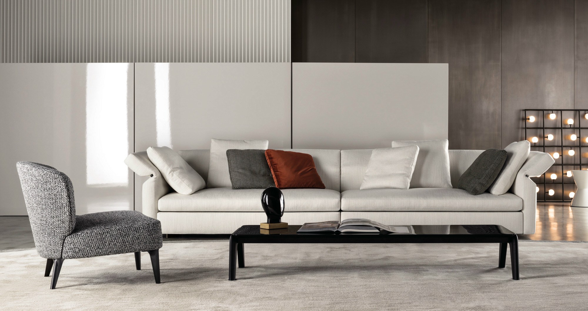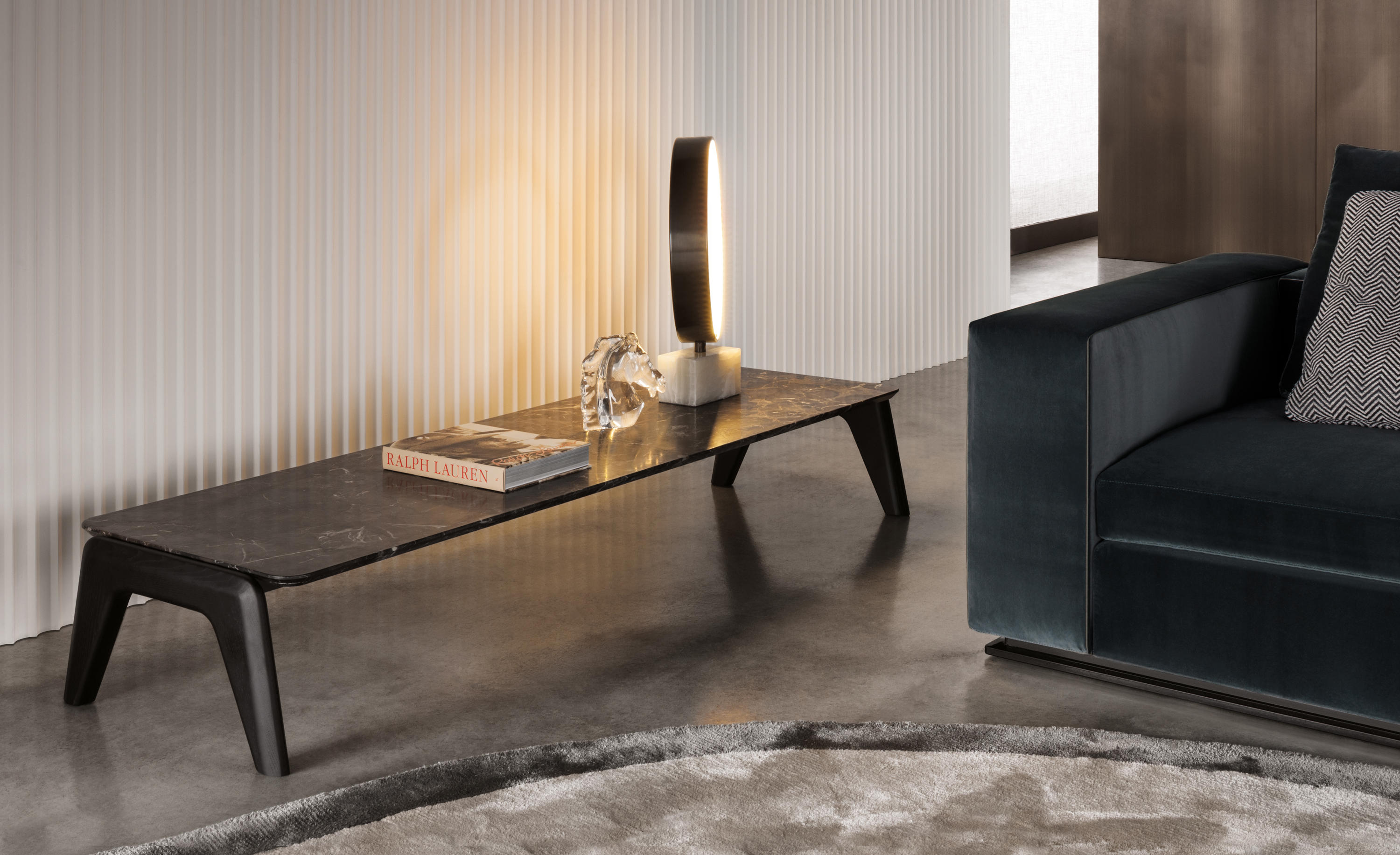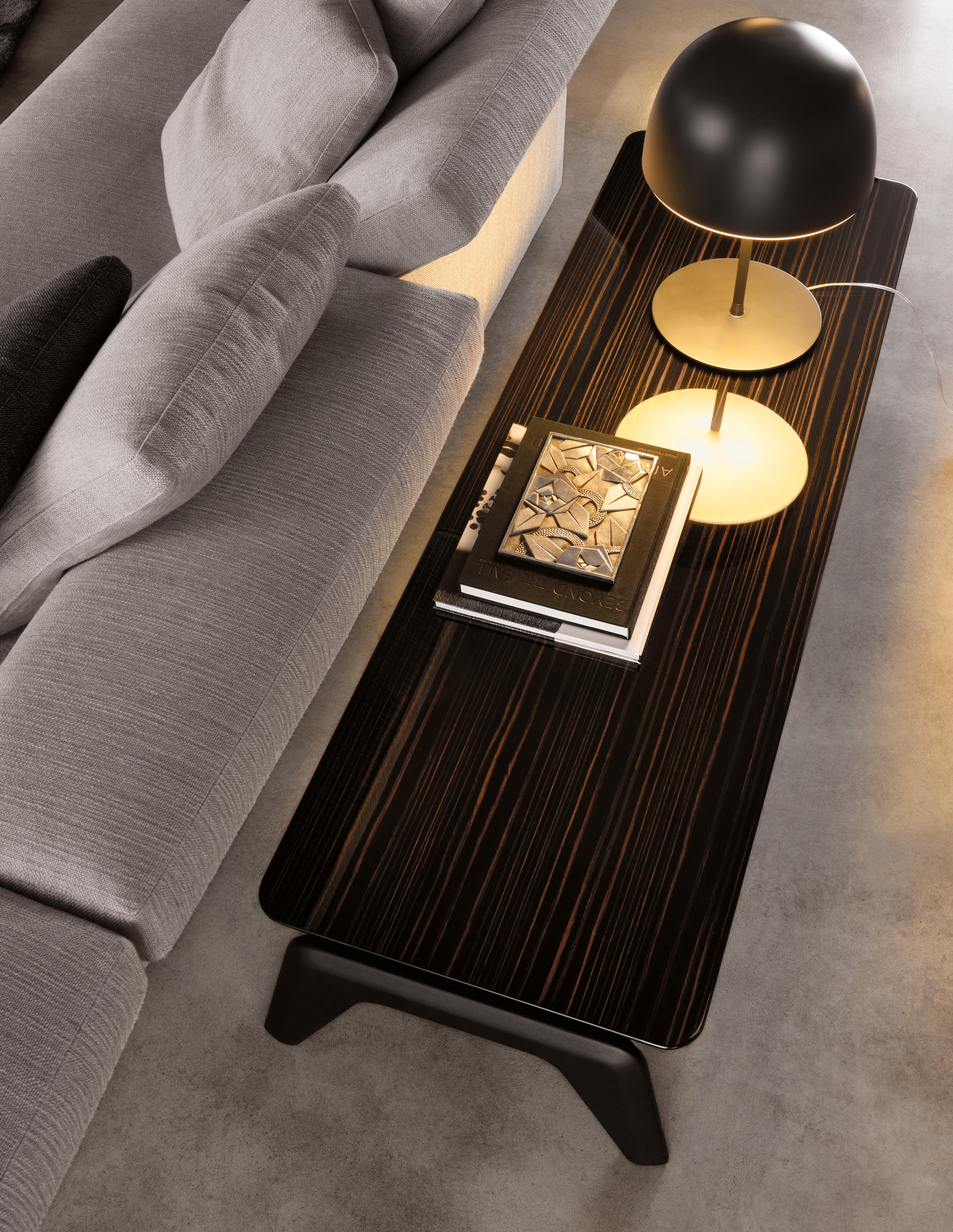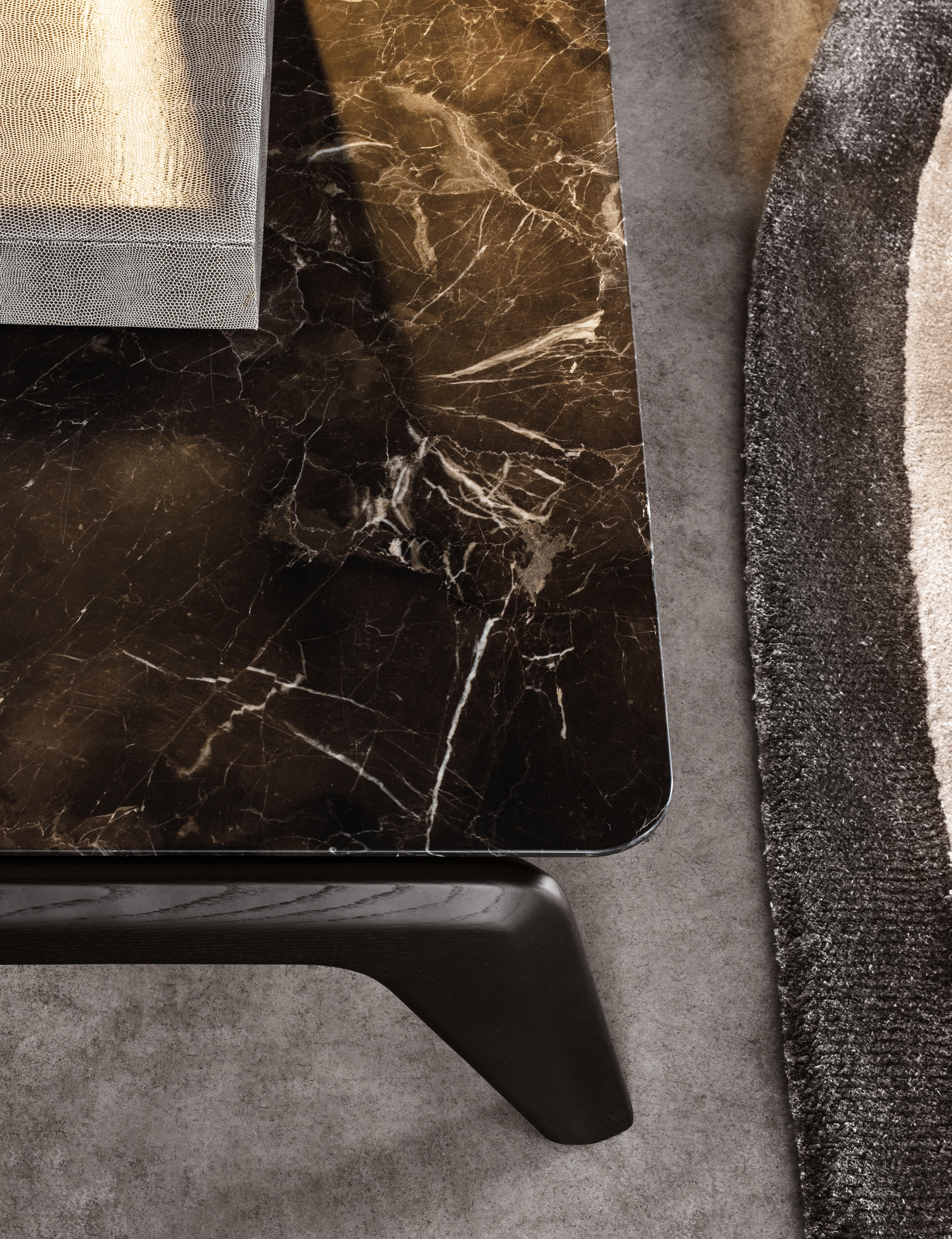 以精美梣木底座致敬传统黑檀木艺术,搭配拥有圆滑转角与柔和饰边的光泽漆面黑檀木、黑色脱蜡琉璃及 Marron Damasco 大理石台板。
