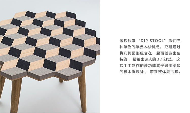 这款独家“Dip Stool”采用三种单色的单板木材制成。 它是通过将几何图形组合在一起而创造出独特的,描绘出迷人的3D幻觉。 这款手工制作的多功能凳子采用柔软的橡木腿设计,带来整体复古感。