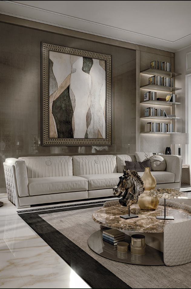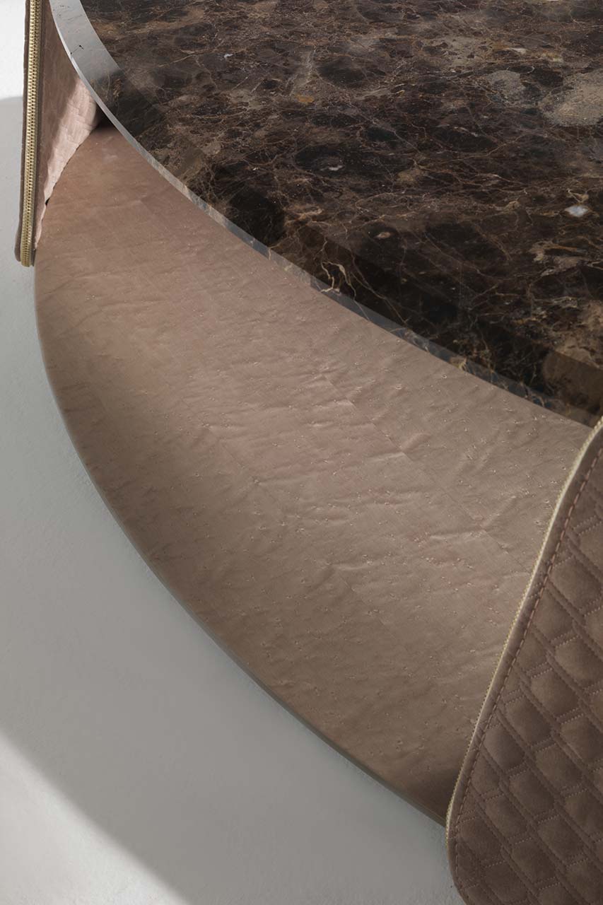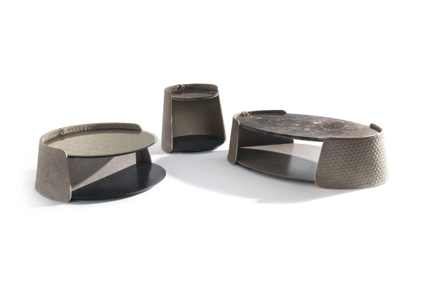 La combinazione della struttura in metallo ricoperto in materiale ricamato con il piano in marmo o in specchio, rende questi tavolini dalla forma arrotondata articoli di alto design.