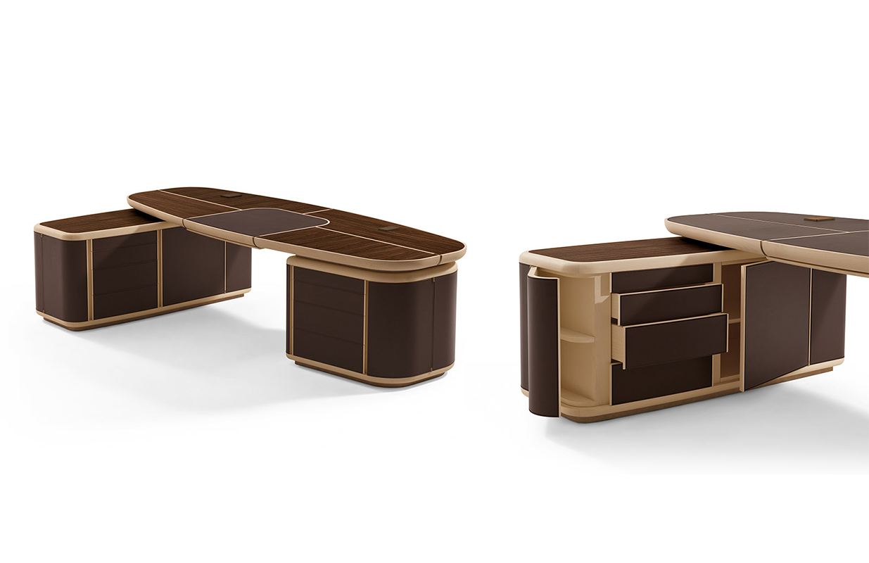 抽屉的柜子是在弯曲胶合板覆盖着马鞍 皮革,完全可移动的抽屉休会 系统关闭滑动跑步者和沉默。 一个中央滑 抽屉里放置两个柜子的抽屉和之间 特点是车厢内的存在,覆盖 与马鞍皮革,笔和纸。 这个概要文件的基础, 顶部插入和抽屉的柜子之间的间隔 和顶部画在青铜色自然效果。