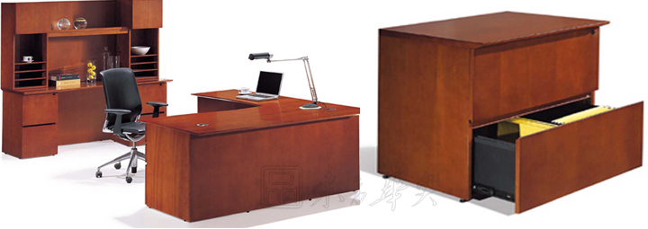 ※ 上图班台的细节展示,保留传统及稳重的气质,典雅的木制行政人员书桌由长方型的主要部分及微弯中心所组成,可随意配合一对两抽屉、三抽屉活动文件柜或连间隔活动文件柜,主要桌面位置可延伸成L型或U型,如需额外储物空间,可加安层叠储物组合并有层板式或柜门可供选择,另外,设有可储存袋装文件夹的两抽屉活动文件柜以配合不同需要。