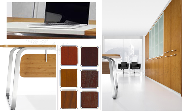 ※ 台面30MM厚,配白色皮垫,亮光不锈钢支撑脚架、毛刷线盖,以及佩带的颜色选择,大班台不同角度的展示,突出每个细节做工的精细,让我们对工艺的细腻产生美的视觉冲击。
