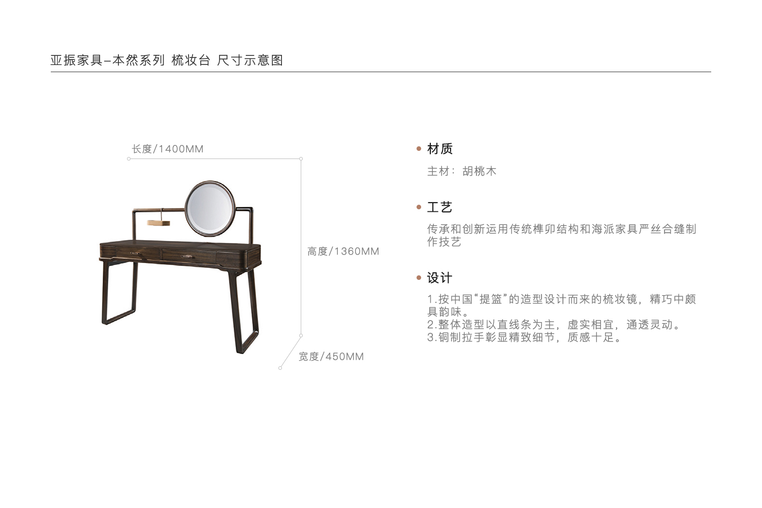 1.按中国“提篮”的造型设计而来的梳妆镜,精巧中颇具韵味。 2.整体造型以直线条为主,虚实相宜,通透灵动。 3.铜制拉手彰显精致细节,质感十足。