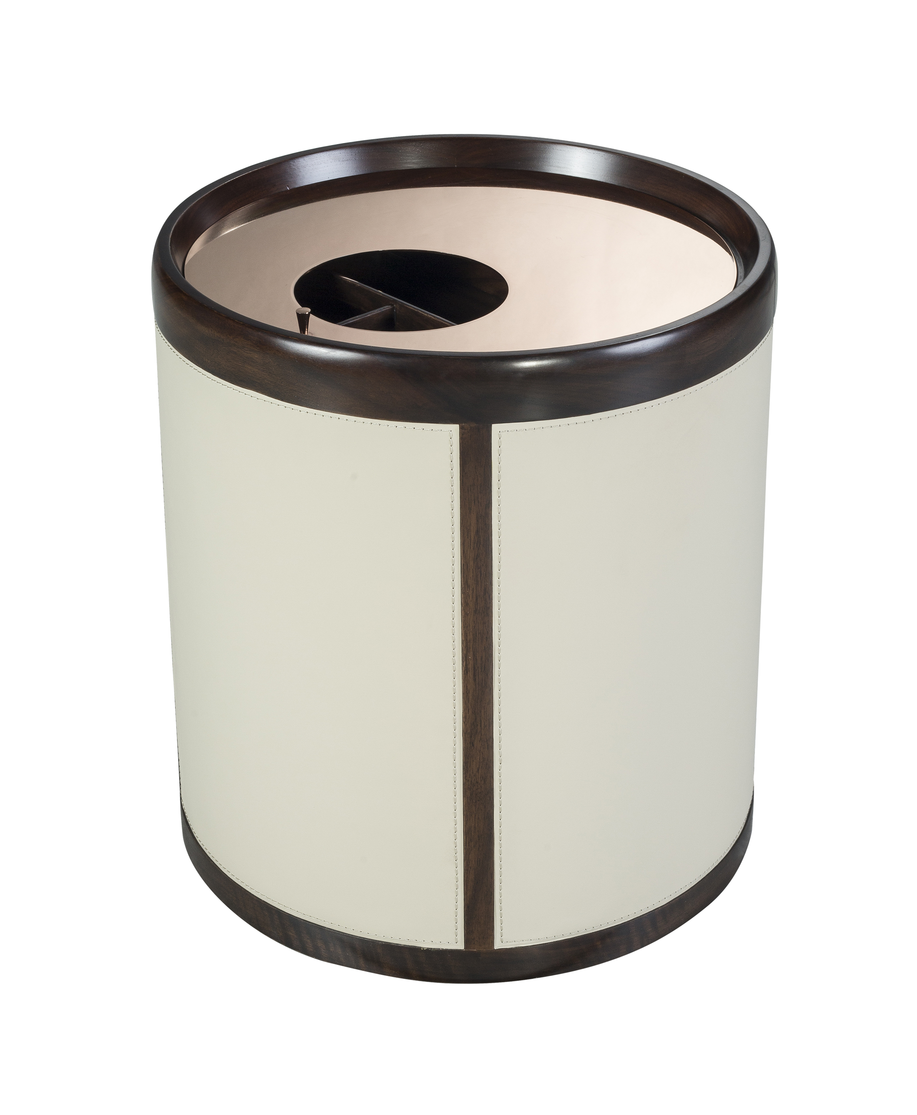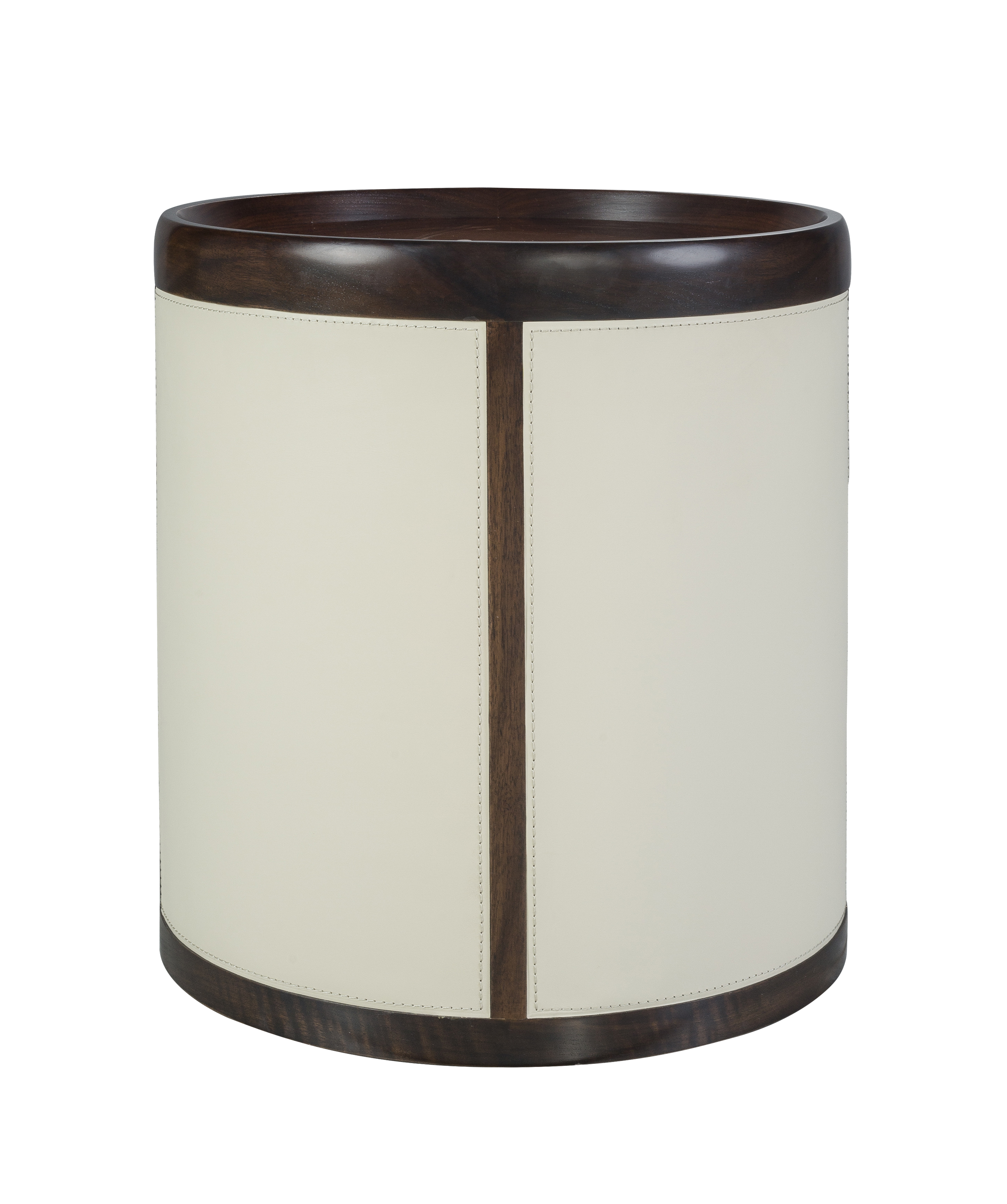 1.黑胡桃木边框与米色进口牛皮的组合,勾勒出圆茶几的精巧简练。 2.通过转动茶几面铜制拉手,可打开不同区域物品,功能分区强。 3.圆茶几小巧干练,可根据需要随意进行家居布置。