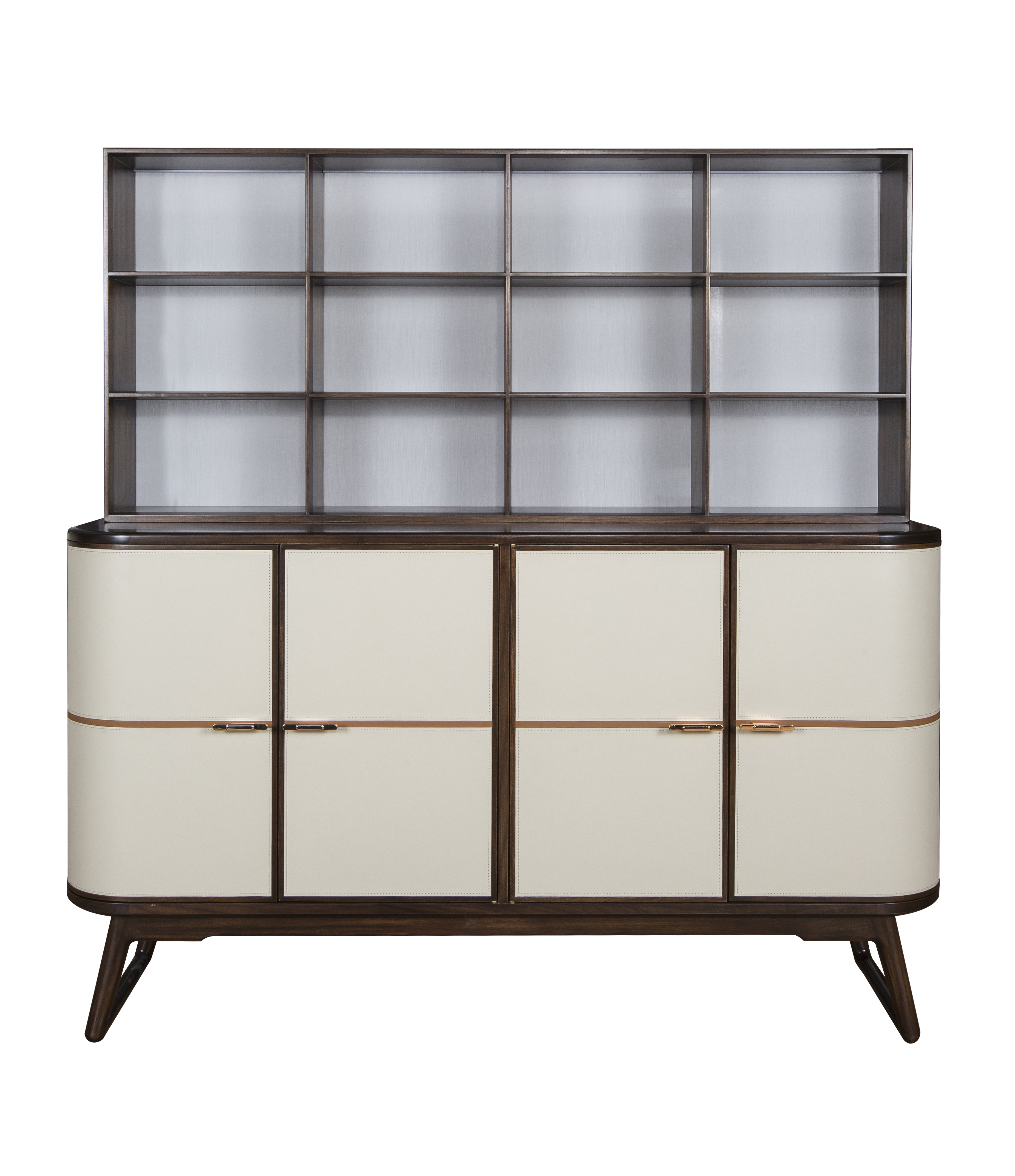 1.整体造型采用上方通透博物架与下方封闭柜体的组合设计形式,兼具展示与储藏功能。 2.柜体腿部内收,上收下分,具有很好的视觉稳定感,稳重大方。 3.简洁铜制拉手,在保证实用性的同时,赋予独特中式韵味,彰显价值。