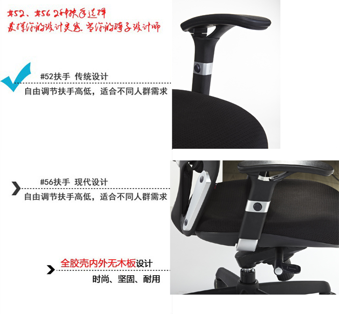 4、可选52、56扶手\尼龙脚架、加大加强脚轮
