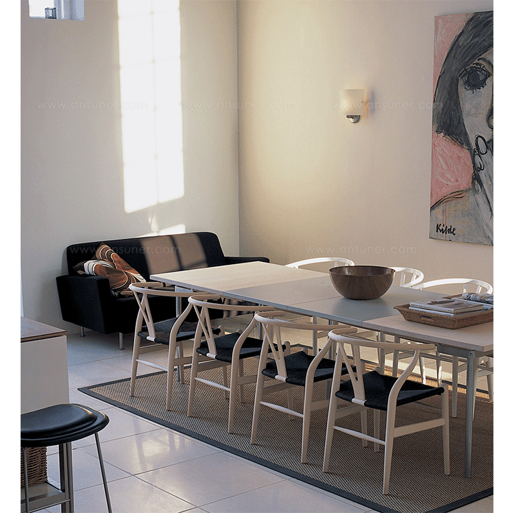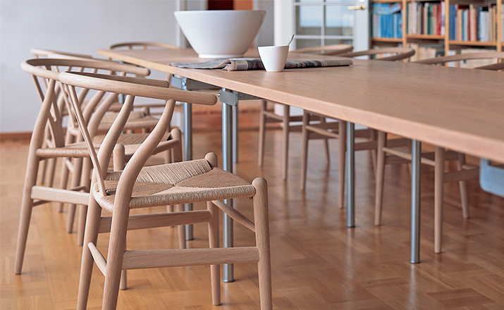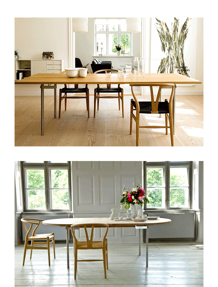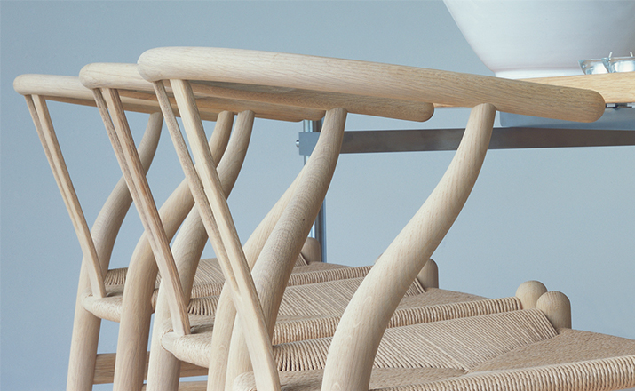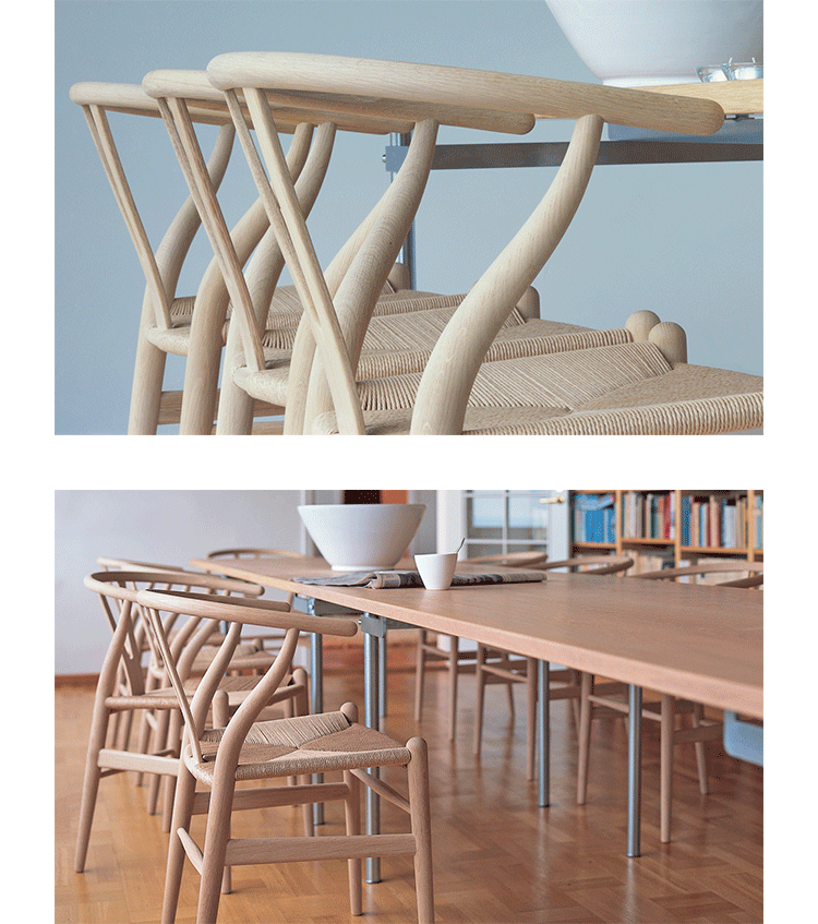 Y椅子是Hans J.Wegner最著名的作品。 它具有重量轻、有吸引力、舒适、中式风格等特点。 该款设计灵感来源于中国传统家具,四平八稳,古色古香,大气自然。上圆下方,浑然天成,深受中国顾客喜欢。Y椅关键在于是工艺与简约的设计,有着清晰的线条。 尽管椅子简约的外观要超过100个步骤进行。除其他事项外,手工编织座垫超过120米的线。 材料有丹麦硬木(橡木,榉木,水曲柳)以及北美硬木(胡桃木,樱桃木)等。外表可漆成各种各样的颜色。 垫子的座位可以添加额外的舒适。