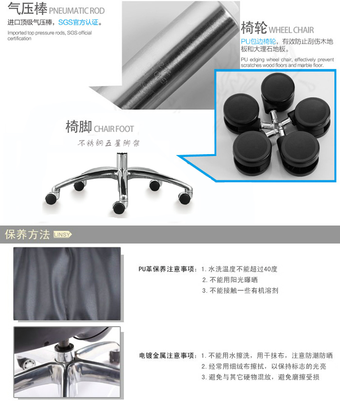 2、高品质定型海绵、多功能底盘、电镀不锈钢五星脚。