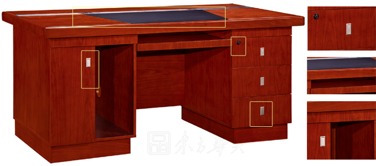 ※ 上图将此款职员台精湛的细节部位另行罗列,例如隐藏式铝合金拉手,按下拉出,实木的收纳式键盘架,镶嵌式梯形皮垫,做工的精细更加突出班台的庄重与典雅,体现出使用者的沉稳和细腻!