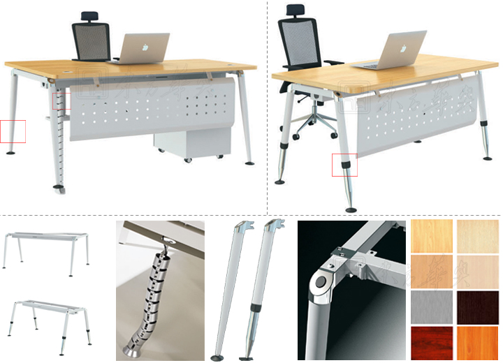 ※ 上图是两款类似办公桌细节展示,椅脚可分为固定和可升降调节,配置时尚脚垫,防滑防刮伤,桌面配置蛇形管,可以防止线路搭乱现象,时尚现代表现的淋漓尽致,搭配喷塑白色,清爽,简洁!