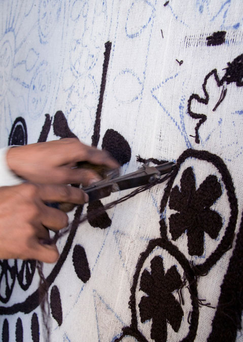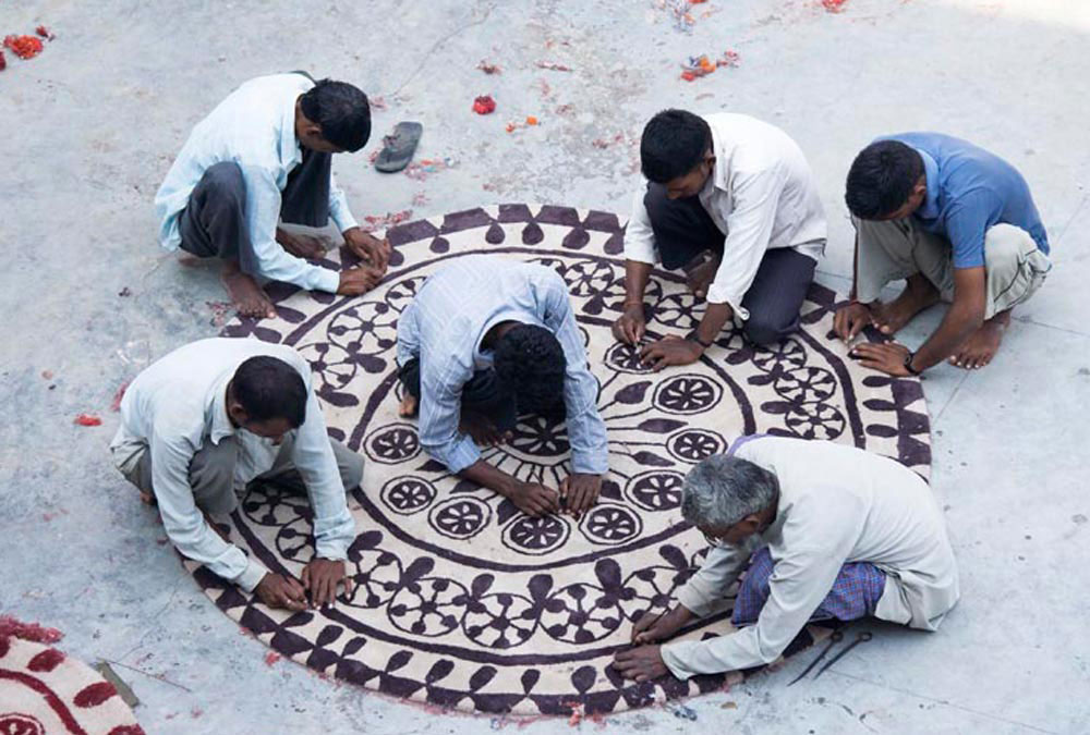 图案通常由花瓣、叶子、彩粉、米粉和其他作为装饰工具的元素组成。受这些作品精华的启发,地毯的设计也保持着同样的意图,作为一种幸福和欢迎的标志。