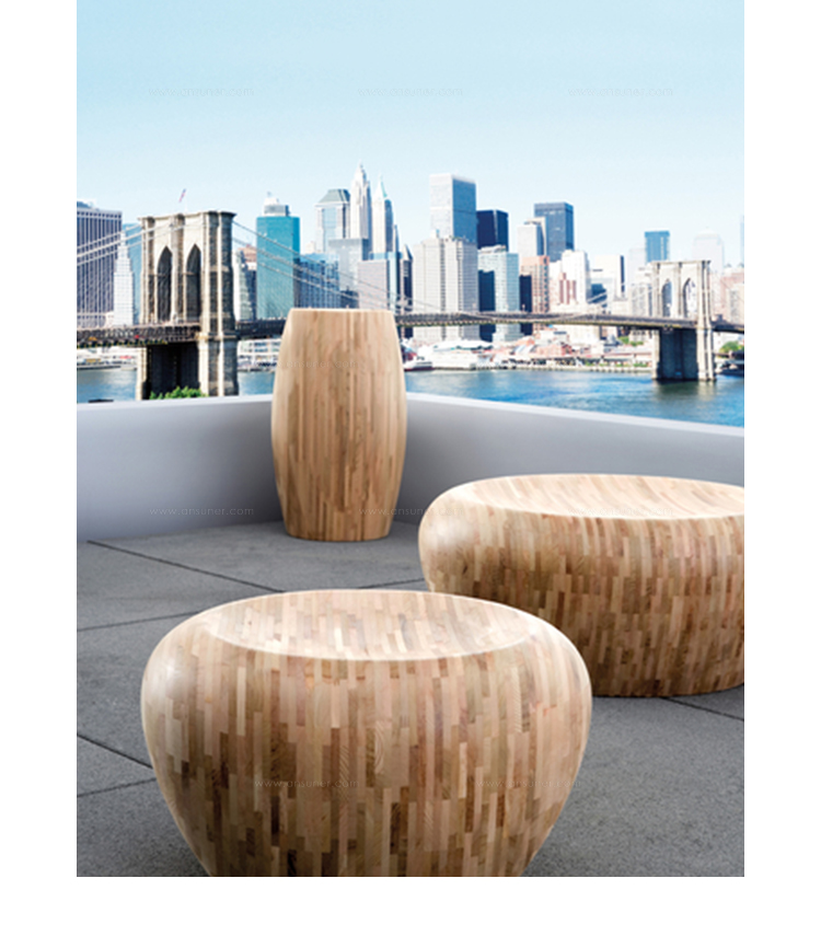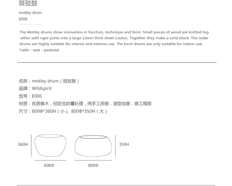 The Motley drums show innovation in function, technique and form.Small pieces of wood are knitted together with nger-joints into a large 12mm thick sheet(cedar).Together they make a solid block.The cedar drums are highly suitable for interior and exterior use.The birch drums are only suitable for indoor use.Table-seat-pedestal.