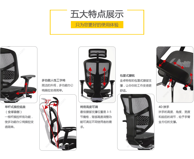 金卓的优美设计有利于持久的舒适和美感。工学椅的结构和功能利用同步倾仰底盘控制功能锁定,滑座和高度调节。高度和角度均可调的扶手和头枕都包含在这张特有的工学椅里。